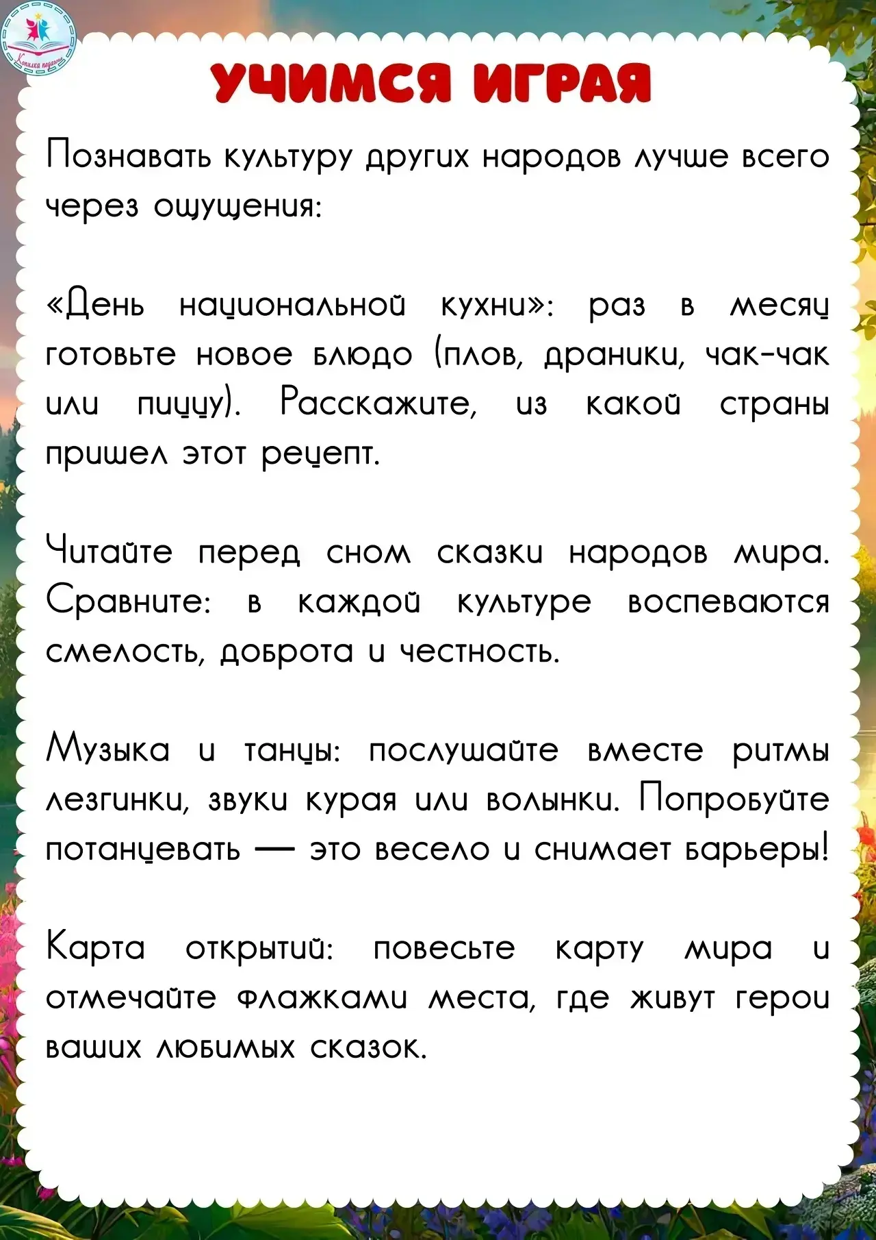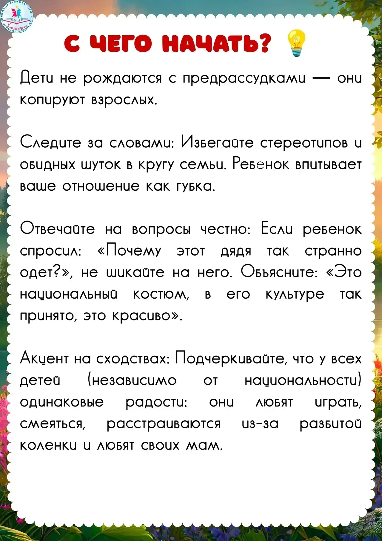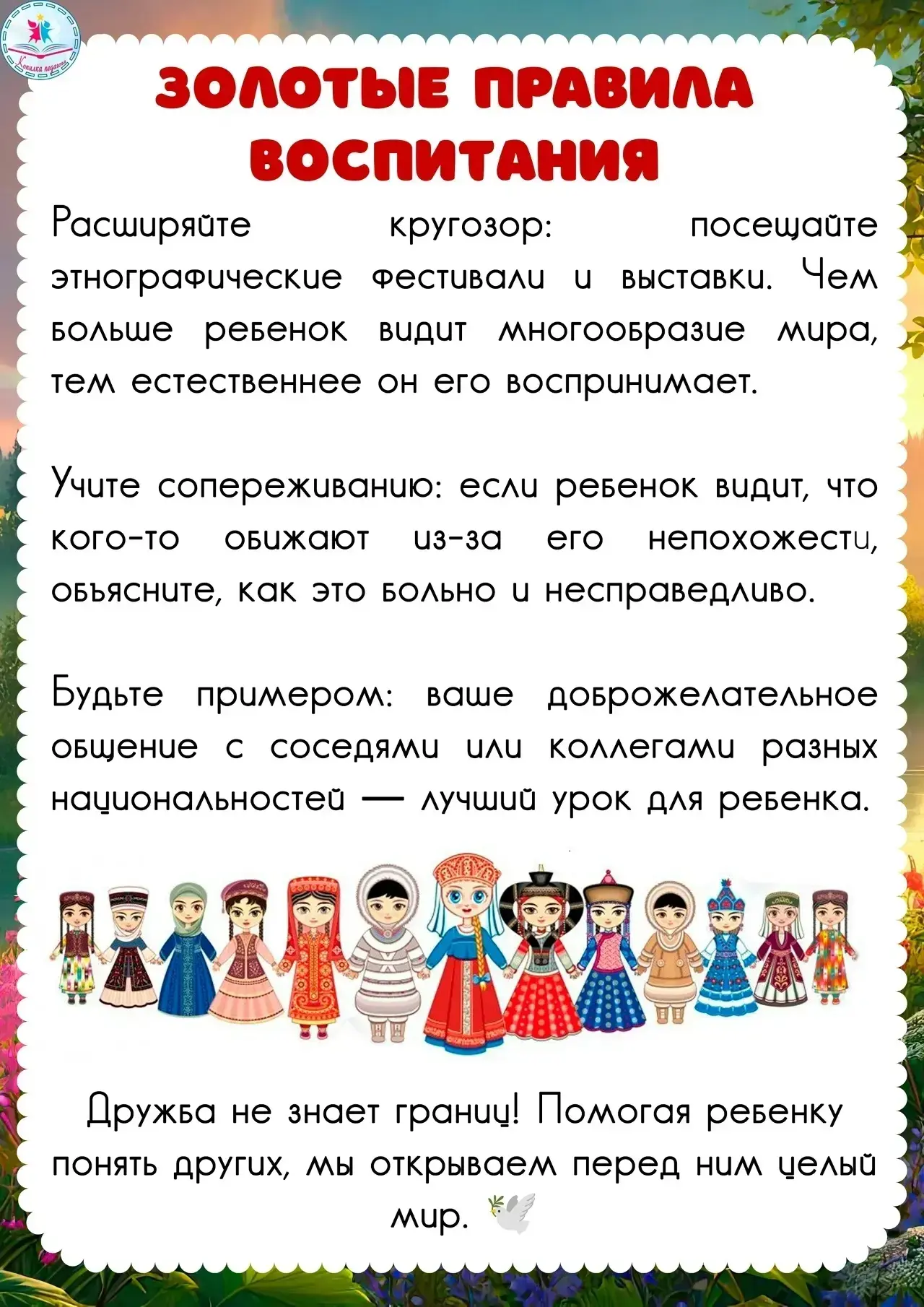 Воспитатель Татьяна Геннадьевна из детского сада "Березка" х. Бейсужек Второй предлагает несколько советов о том, как воспитать у ребёнка уважение к людям других национальностей и их культуре.
