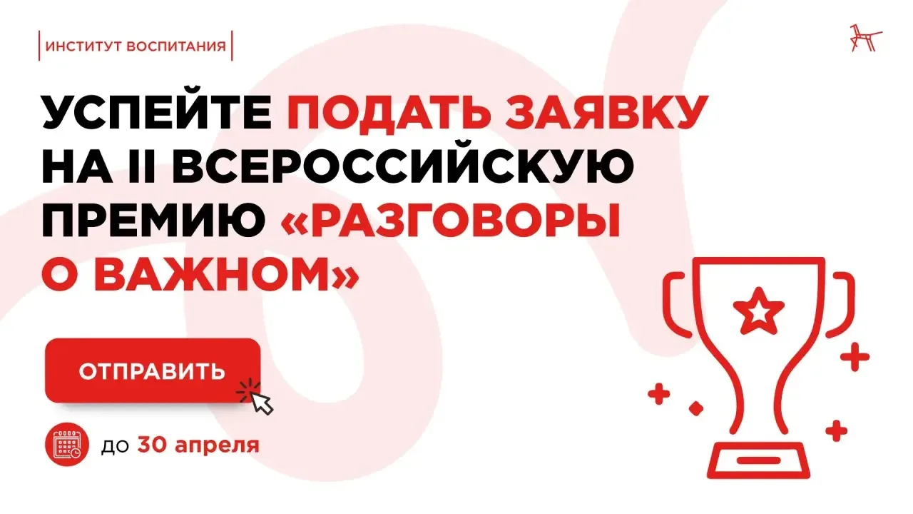 Приём заявок на премию «Разговоры о важном» продлён до 30 апреля, но время остаётся немного. Выбирайте своё направление в номинации «Создавая важный разговор»: