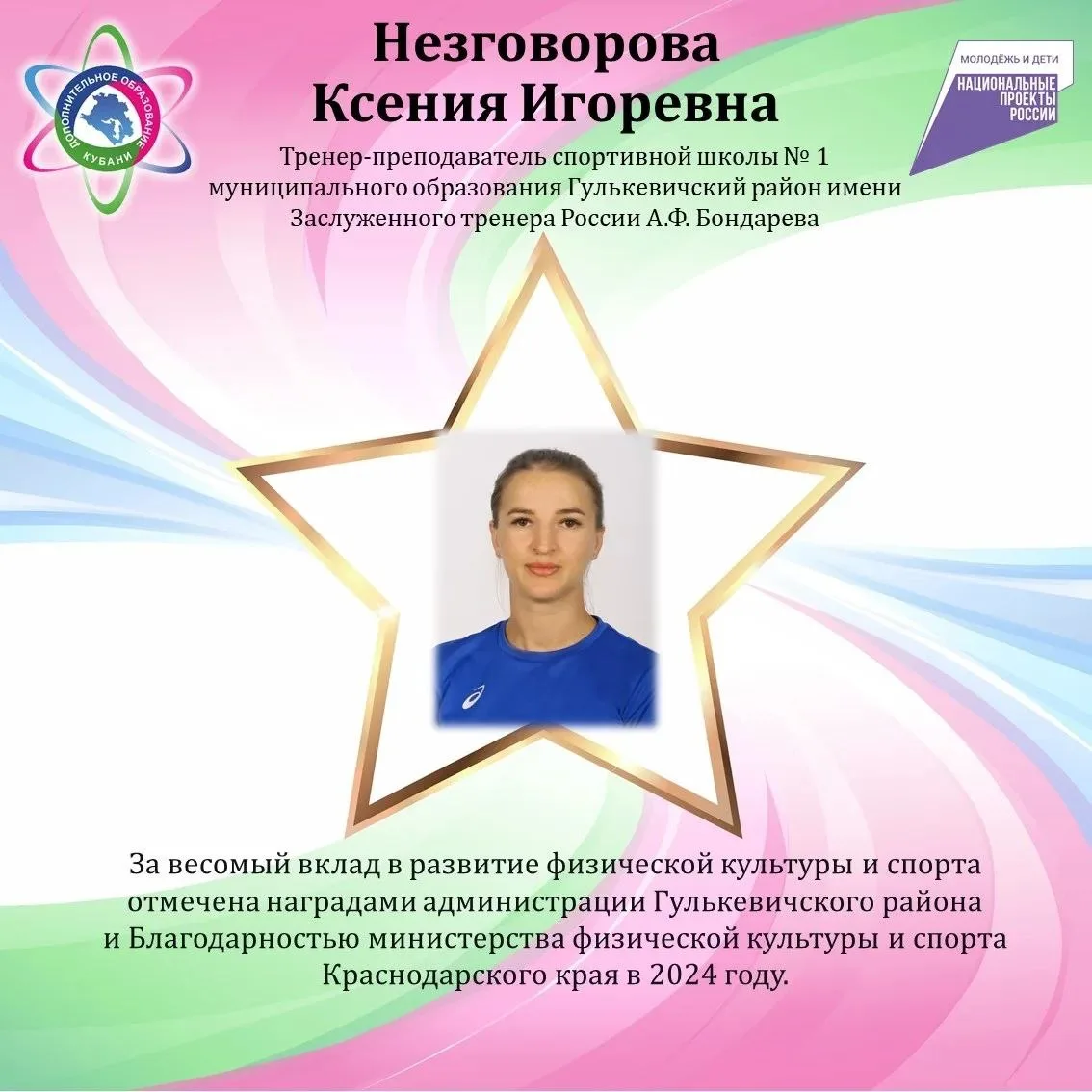 🔹 Тренер-преподаватель спортшколы №1 по вольной борьбе Ксения Игоревна Незговорова. Отмечена Благодарностью министерства спорта края и наградами районной администрации за развитие физкультуры и спорта. Ксения Игоревна воспитала чемпионку Европы 2025 г. по вольной борьбе Варвару Ремизову, открыла многим воспитанникам спортивные азы.