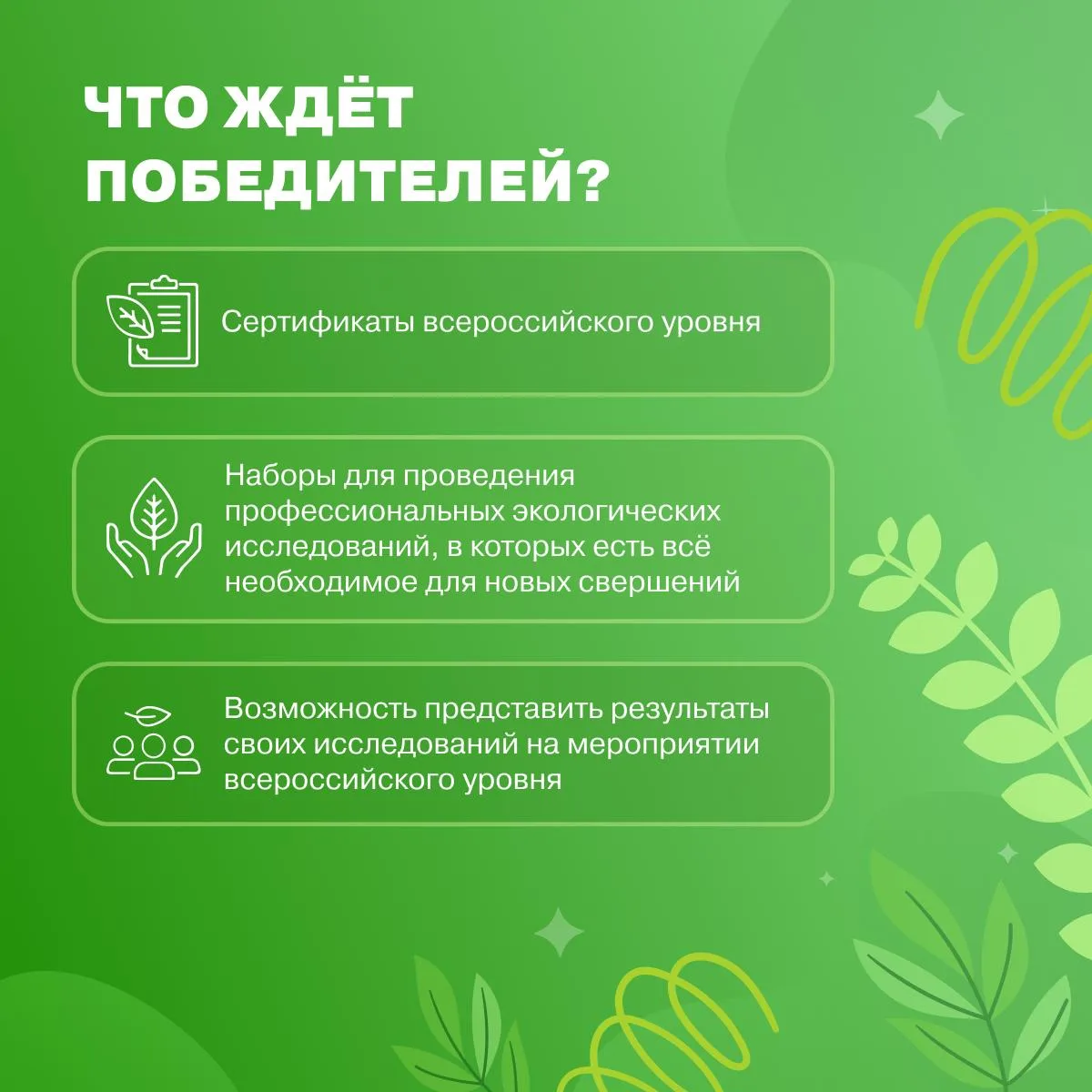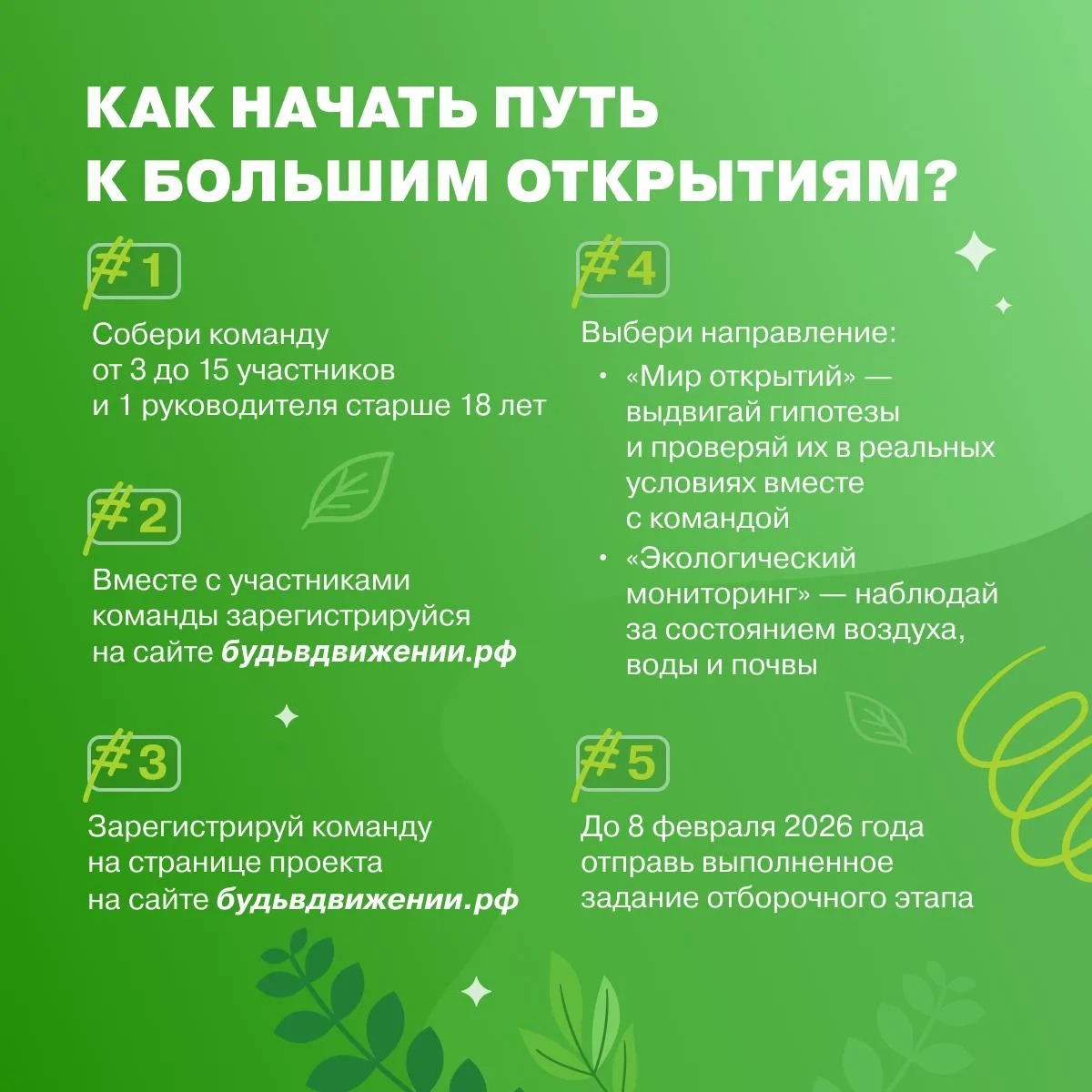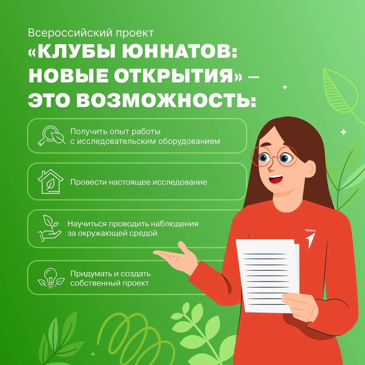 В проекте «Клубы юннатов: новые открытия» ты сможешь объединить вокруг себя единомышленников, стать настоящим экологом, провести эксперименты, сделать классные открытия и поделиться ими с тысячами ребят со всей страны!