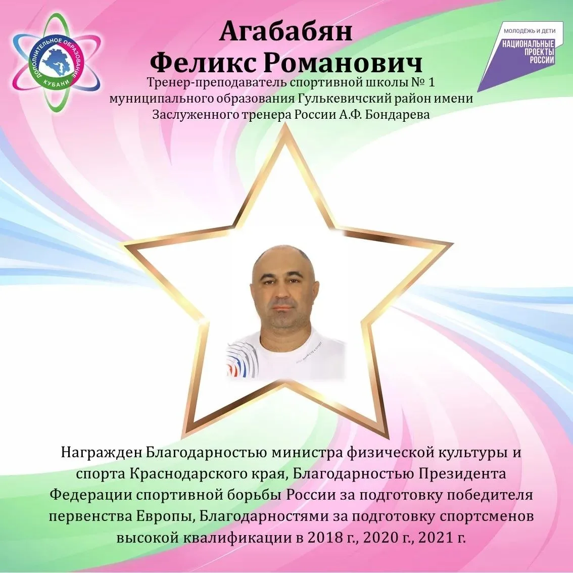 🔹 Тренер-преподаватель спортшколы №1 по вольной борьбе Феликс Романович Агабабян. Он награжден Благодарностью министра ФКиС края, Благодарностью Президента Федерации спортивной борьбы России за подготовку победителя первенства Европы Александры Скиренко, Благодарностями за подготовку спортсменов высшей квалификации в последние годы.