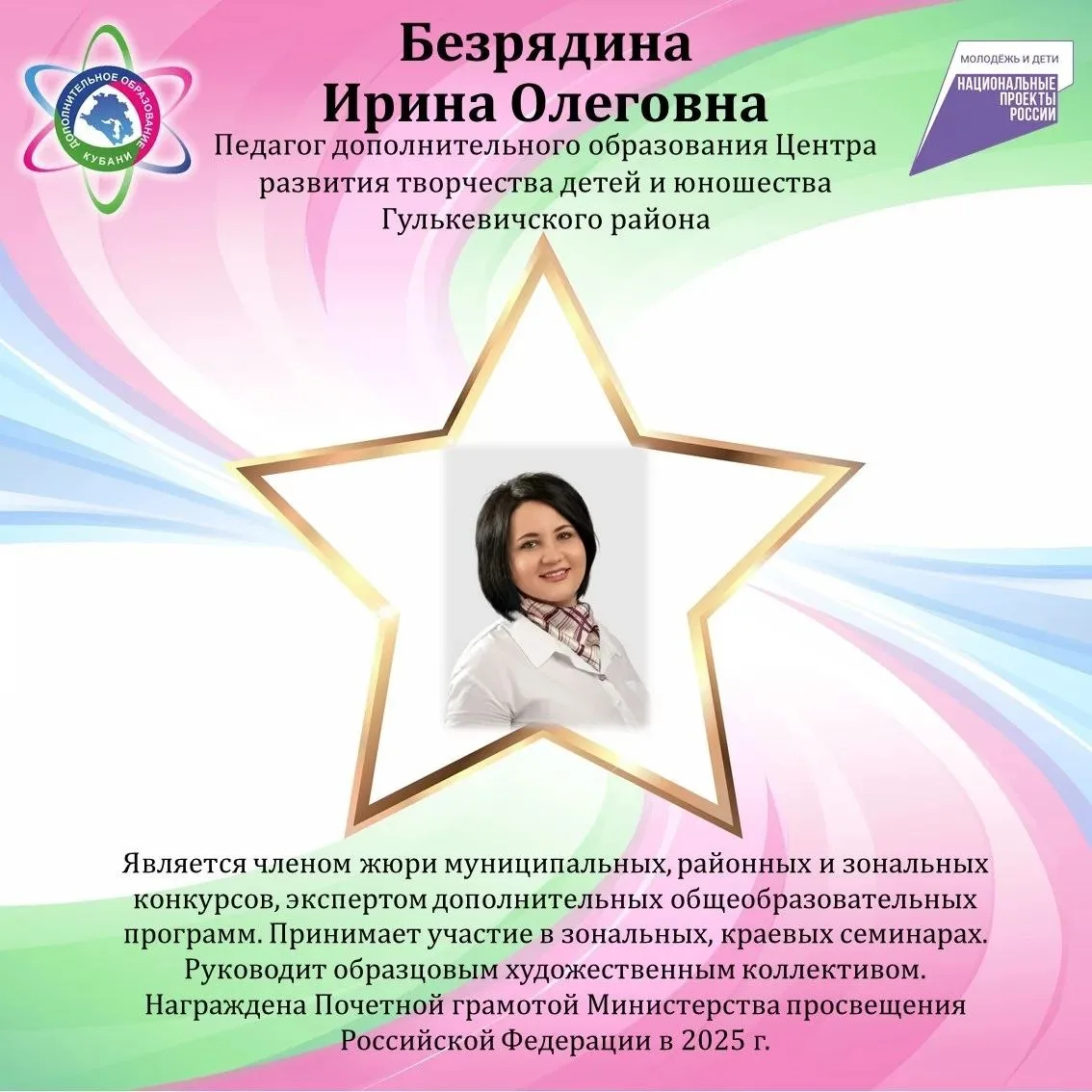 🔸 Педагог дополнительного образования районного ЦРТДЮ Ирина Олеговна Безрядина. Это педагог-новатор. Она умело раскрывает творческие возможности детей и руководит образцовым художественным объединением «Яркая палитра». За последние 5 лет ее воспитанники завоевали 35 наград различного уровня - от муниципального до Всероссийского.
