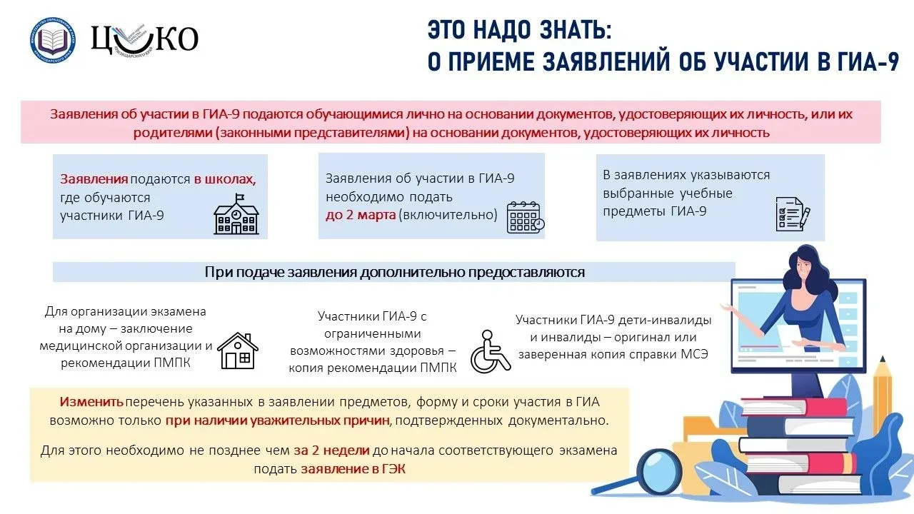 Девятиклассники подают заявления в своей школе. В заявлении необходимо указать выбранные для сдачи учебные предметы и форму итоговой аттестации – основной государственный экзамен (ОГЭ) или государственный выпускной экзамен (ГВЭ).