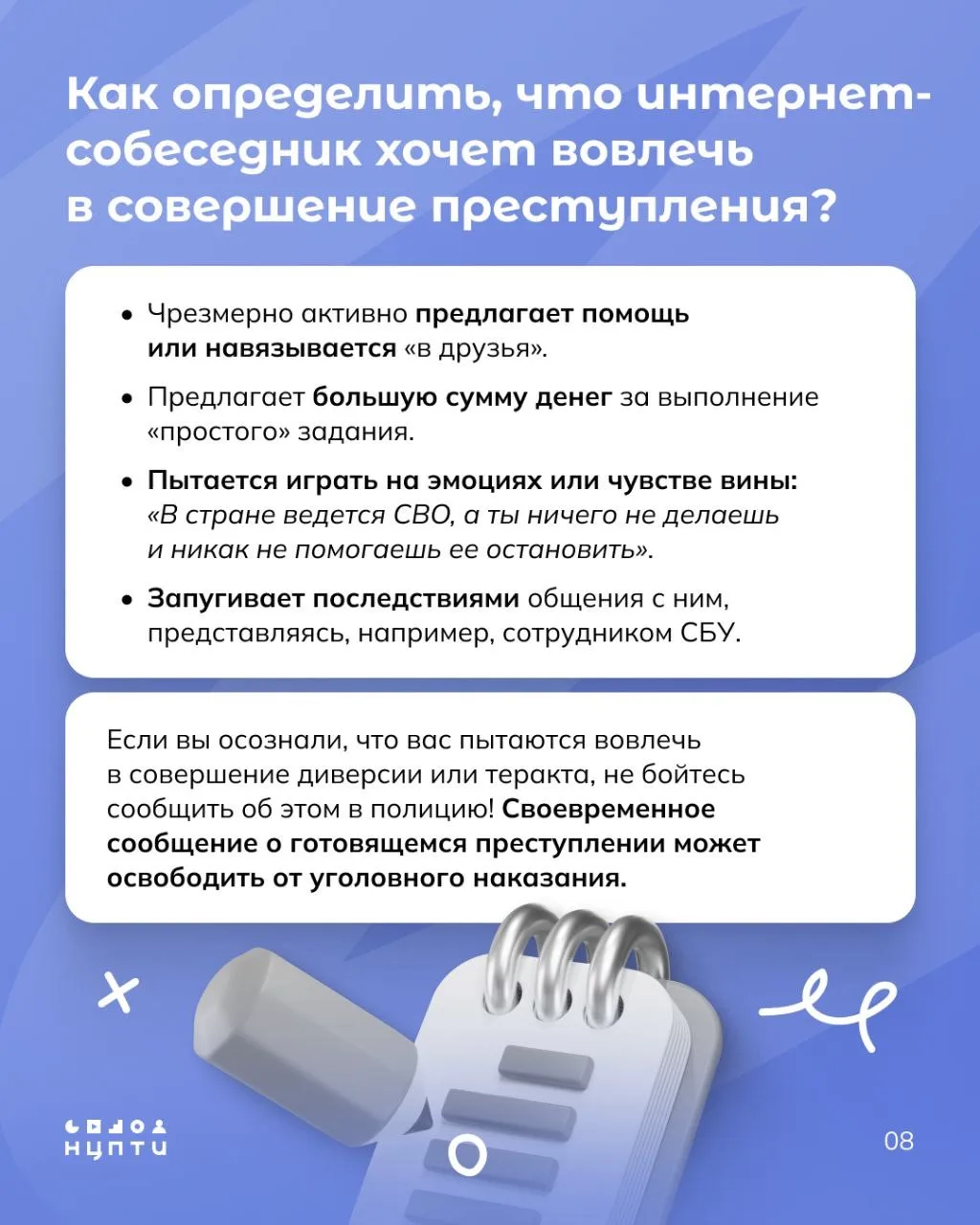 Сегодня подростки всё чаще оказываются вовлечёнными в противоправные действия, порой даже не осознавая последствий. Опасную роль играют и вербовщики, которые намеренно вводят детей в заблуждение, уверяя: «Ты же ещё ребёнок, тебе за это ничего не будет».