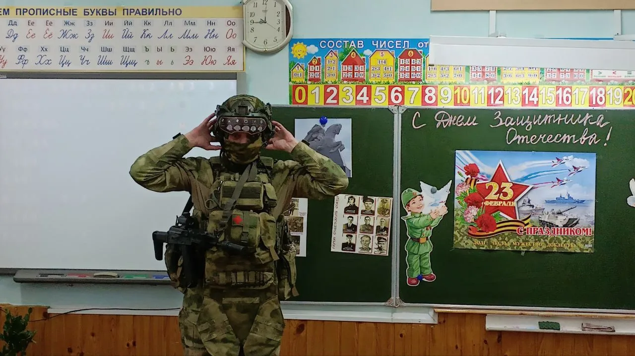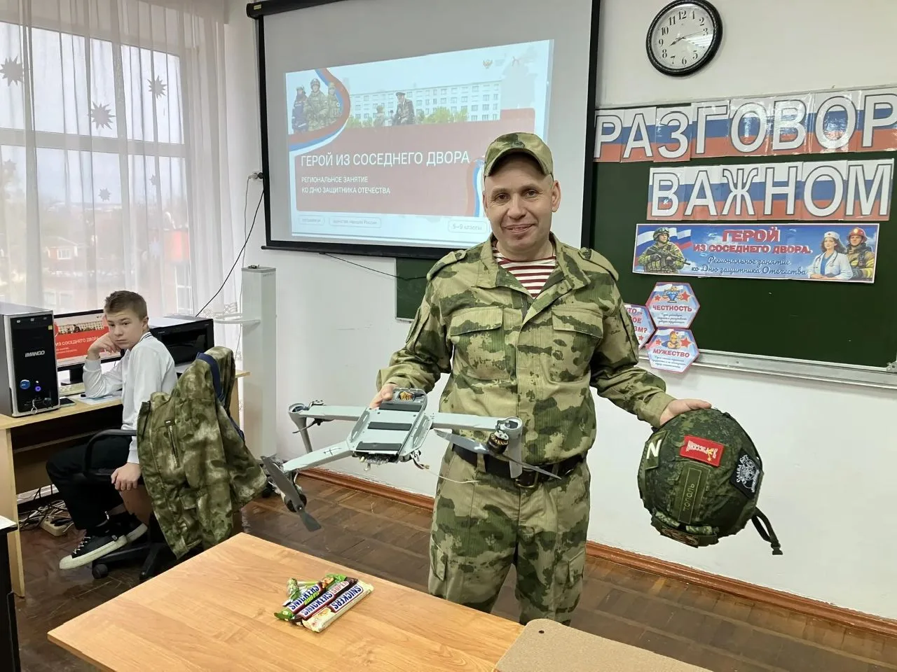 В преддверии Дня защитника Отечества в 3 «Б» классе прошла особенная встреча. К нам в гости пришёл настоящий герой — папа одного из учеников, участник специальной военной операции Савастьянов Дмитрий Владимирович (позывной «Бирюк»).