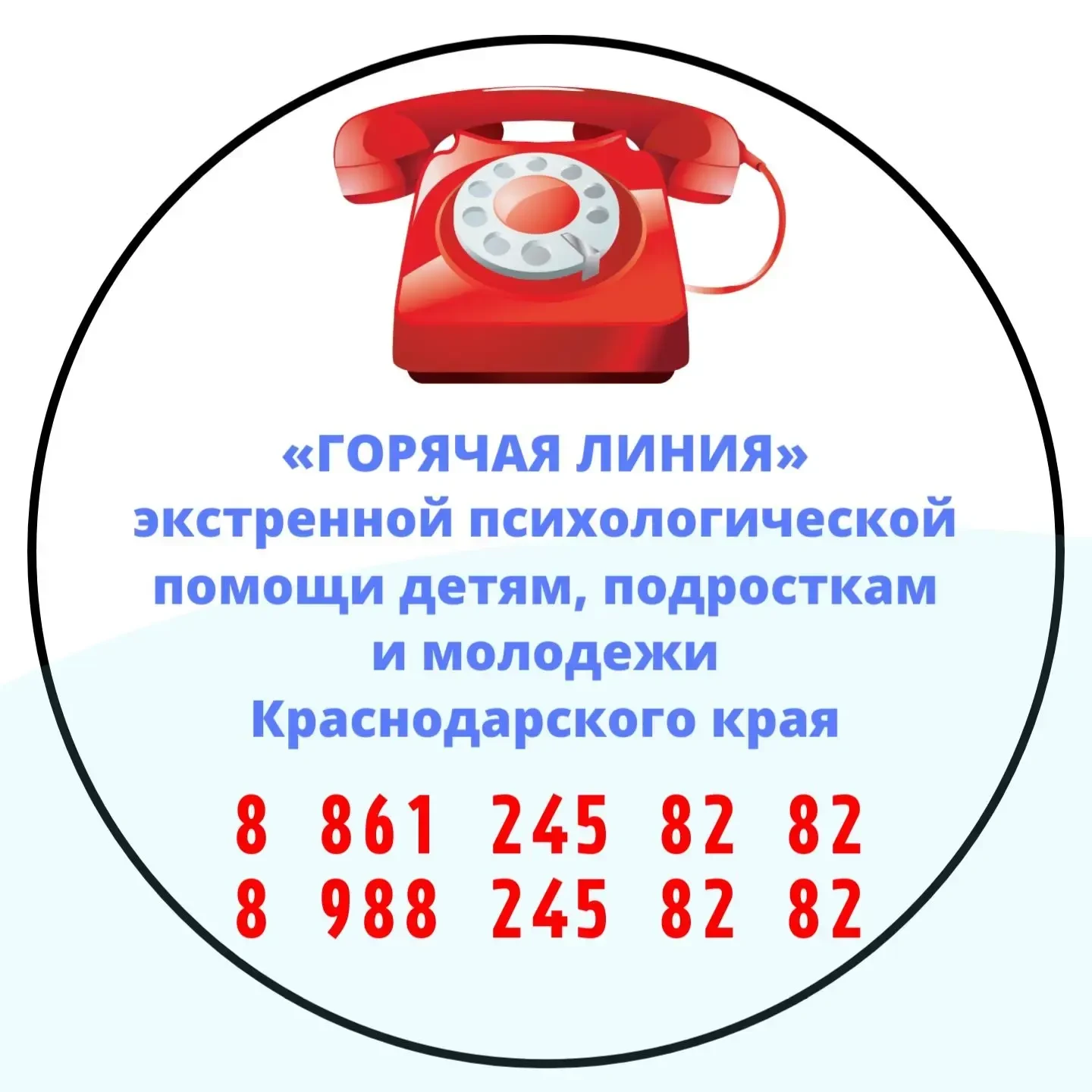 ☎ Кроме того, работает региональная ГОРЯЧАЯ ЛИНИЯ экстренной психологической помощи детям, подросткам и молодежи: +7(861)245-82-82, +7(988)245-82-82. На телефонах ГОРЯЧЕЙ ЛИНИИ работают психологи краевого Центра диагностики и консультирования. Это педагоги, прошедшие обучение по специальным программам, связанным с телефонным консультированием детей и оказанием экстренной психологической помощи.