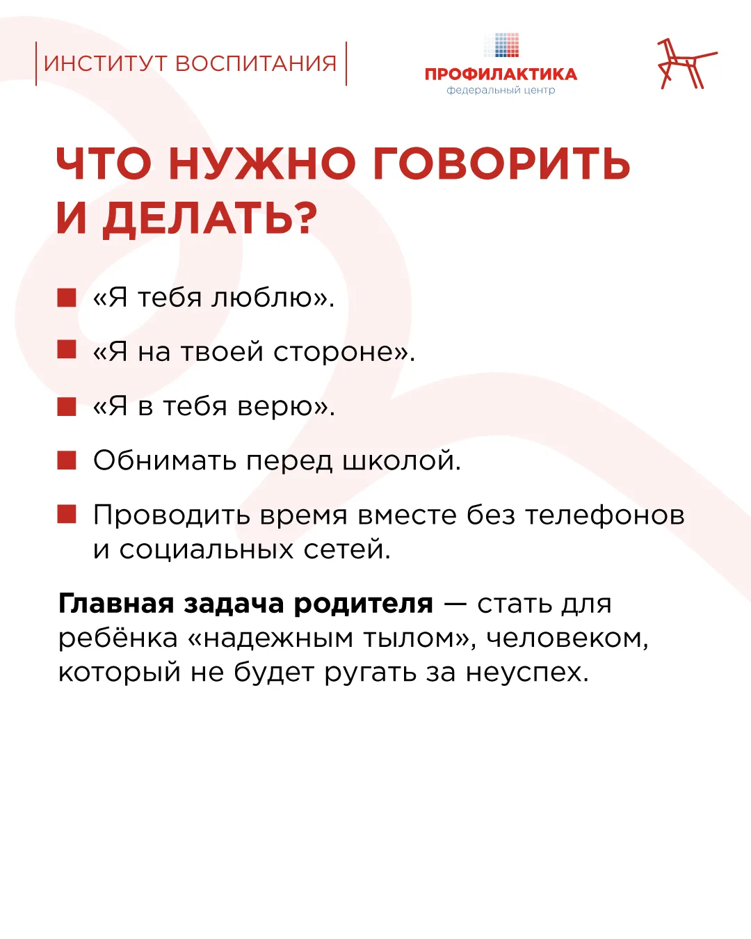 Призываем вас найти время для откровенного разговора с детьми. Спросите, что их тревожит, как обстоят дела с друзьями, чем они увлекаются, что происходит в их жизни помимо учёбы.