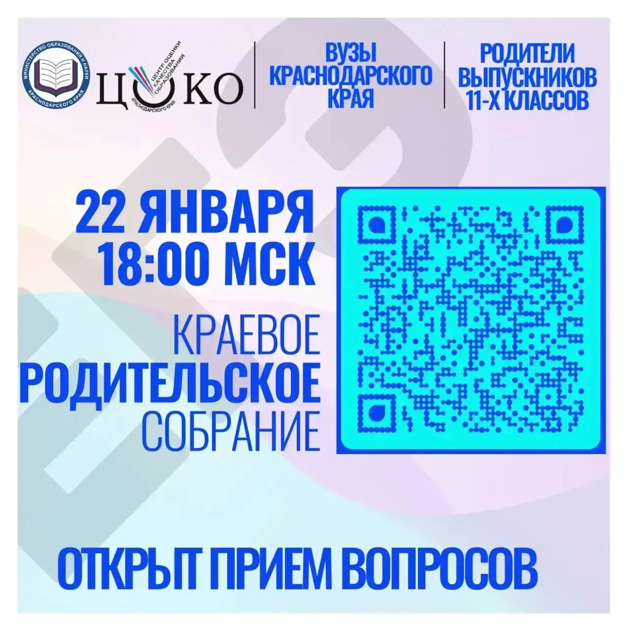 22 января в 18.00 часов состоится краевое родительское собрание для родителей выпускников 11 классов по вопросу подготовки к ЕГЭ и выбора будущей профессии с участием представителей кубанских вузов.