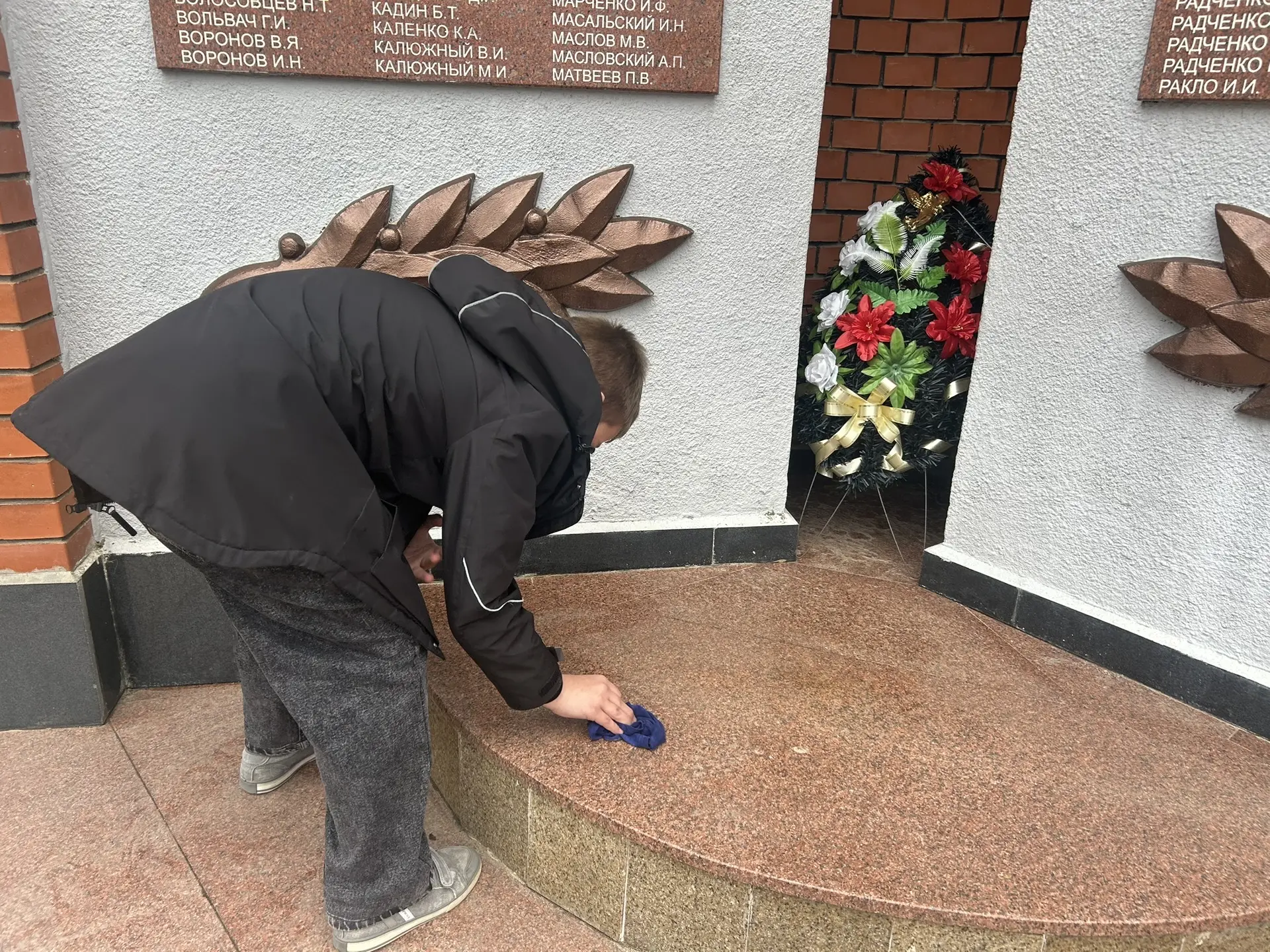 Ребята очистили могилу от сорной растительности, веток и опавшей хвои, подмели территорию и отмыли памятник от пыли и грязи.