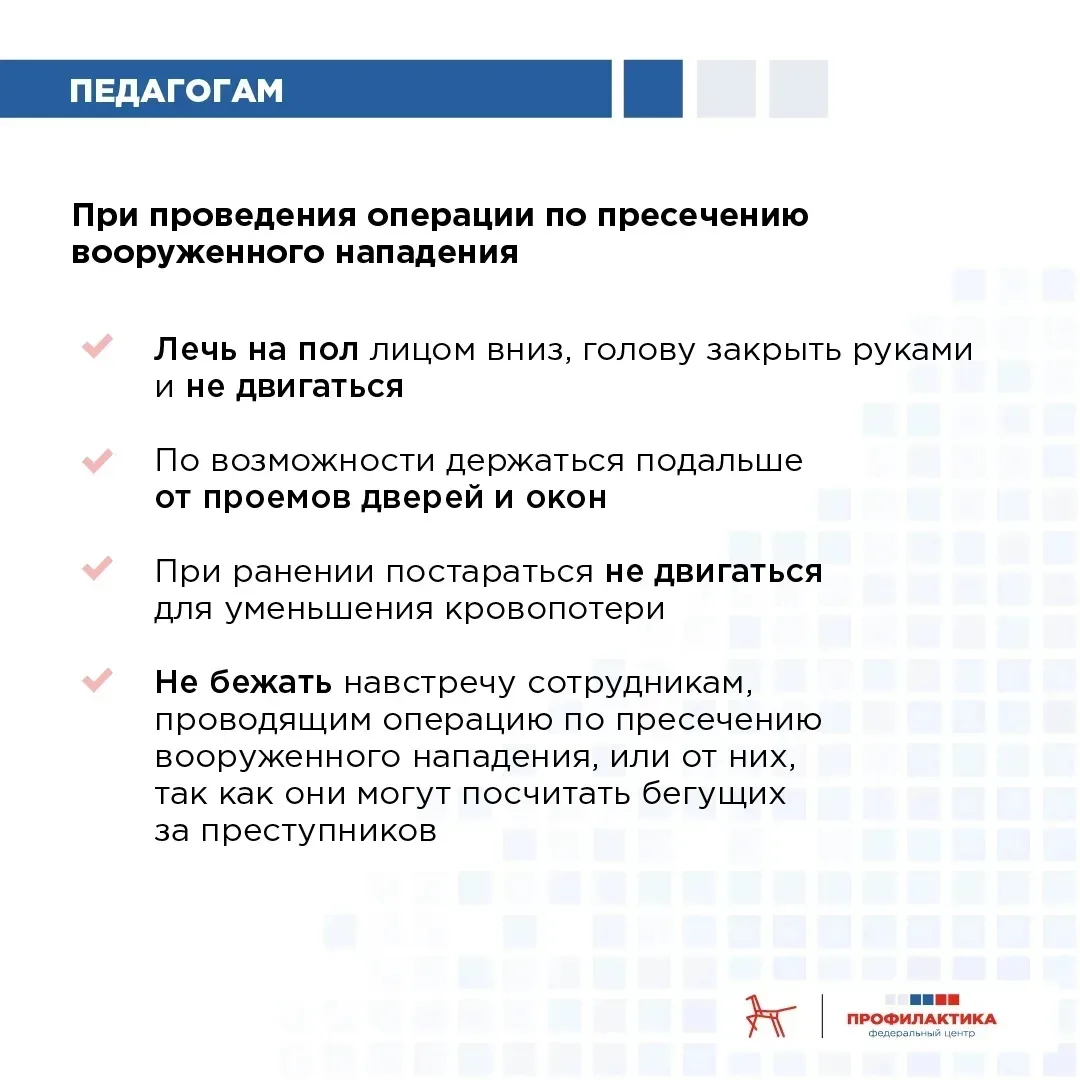 В чрезвычайных ситуациях крайне важно сохранять спокойствие и действовать чётко и оперативно согласно заранее утверждённому алгоритму. В карточках — инструкция для педагогов о том, что делать при вооружённом нападении ⤴️