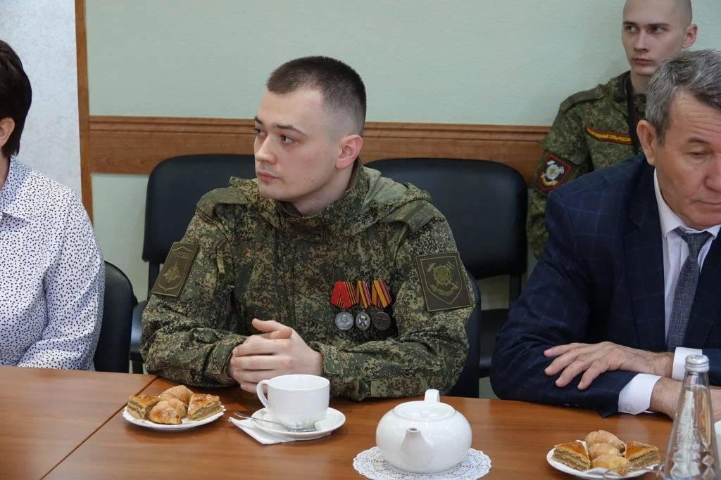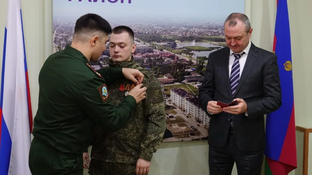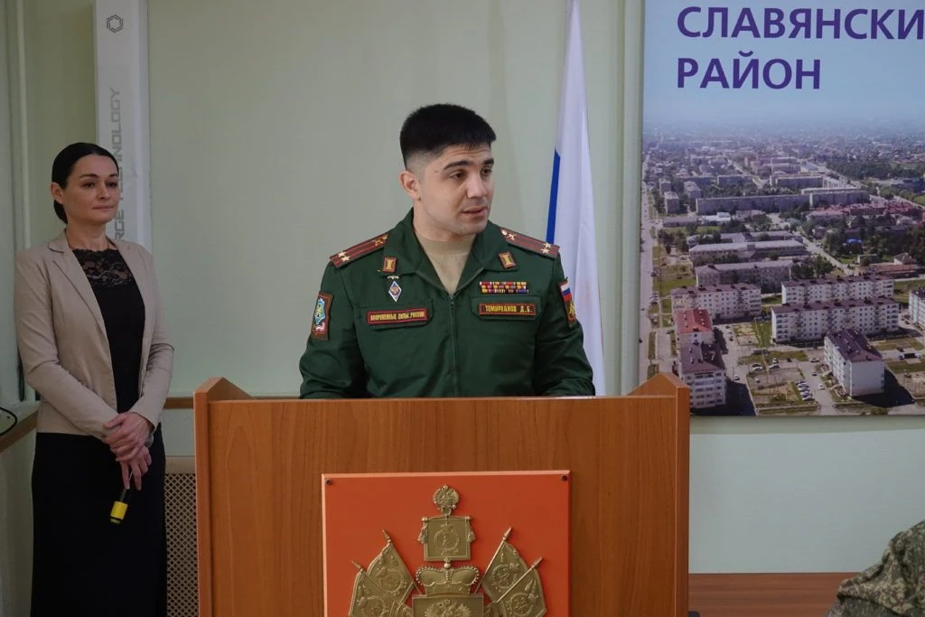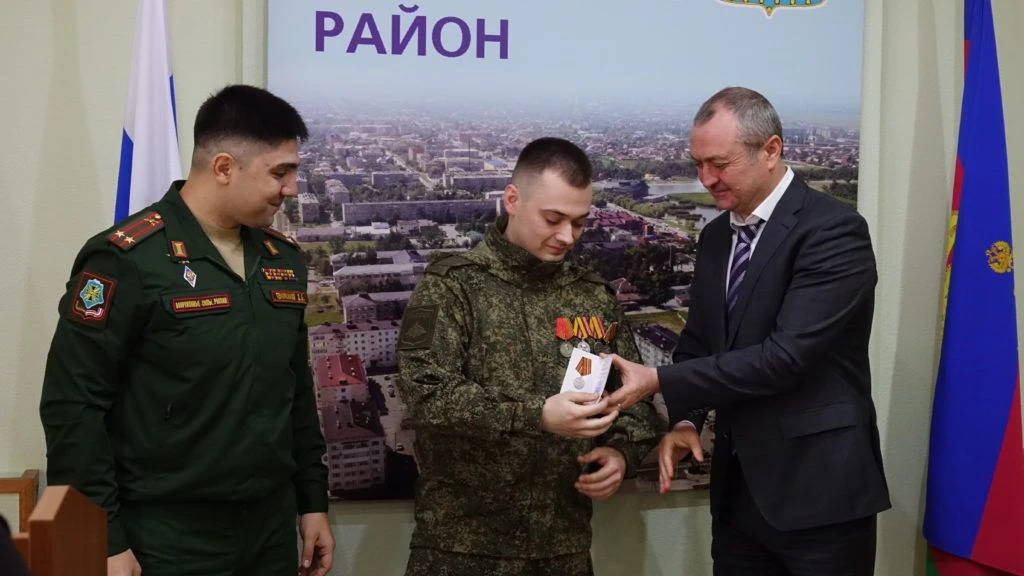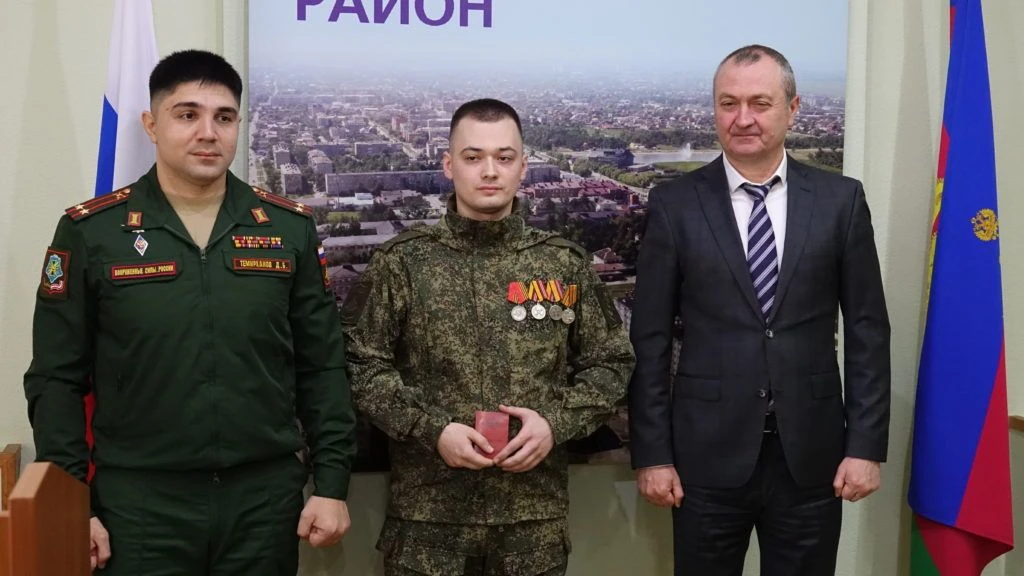 На торжественном мероприятии, состоявшемся в администрации Славянского района 25 февраля 2026 года, временно исполняющий обязанности заместителя командующего войсками Южного военного округа по военно-политической работе подполковник Дереник Темирханов и глава Славянского района Роман Синяговский вручили начальнику радиостанции взвода связи ремонтно-восстановительного батальона ефрейтору Артему Колмыкову медаль «За боевые отличия» за отвагу и самоотверженность, проявленные при выполнении задач в боевых условиях и при проведении специальных операций в условиях, сопряженных с риском для жизни.