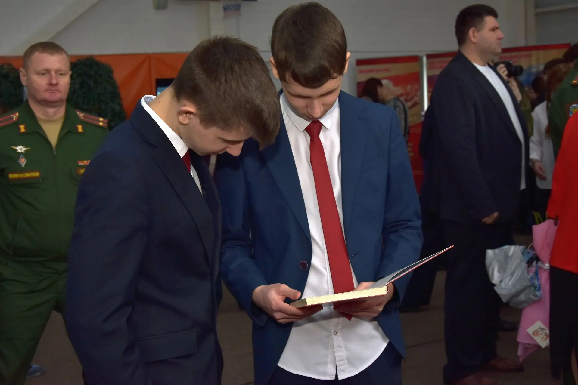 На завершающем этапе Урока подполковник Темирханов и ефрейтор Колмыков приняли участие в церемонии присяги юнармейцев. Юные патриоты принесли торжественную клятву на верность Отечеству и всему юнармейскому братству. В честь посвящения гости вручили юнармейцам значки Всероссийского детско-юношеского военно-патриотического общественного движения «Юнармия» и юнармейские книжки. По окончанию церемонии администрация лицея и гости обменялись подарками