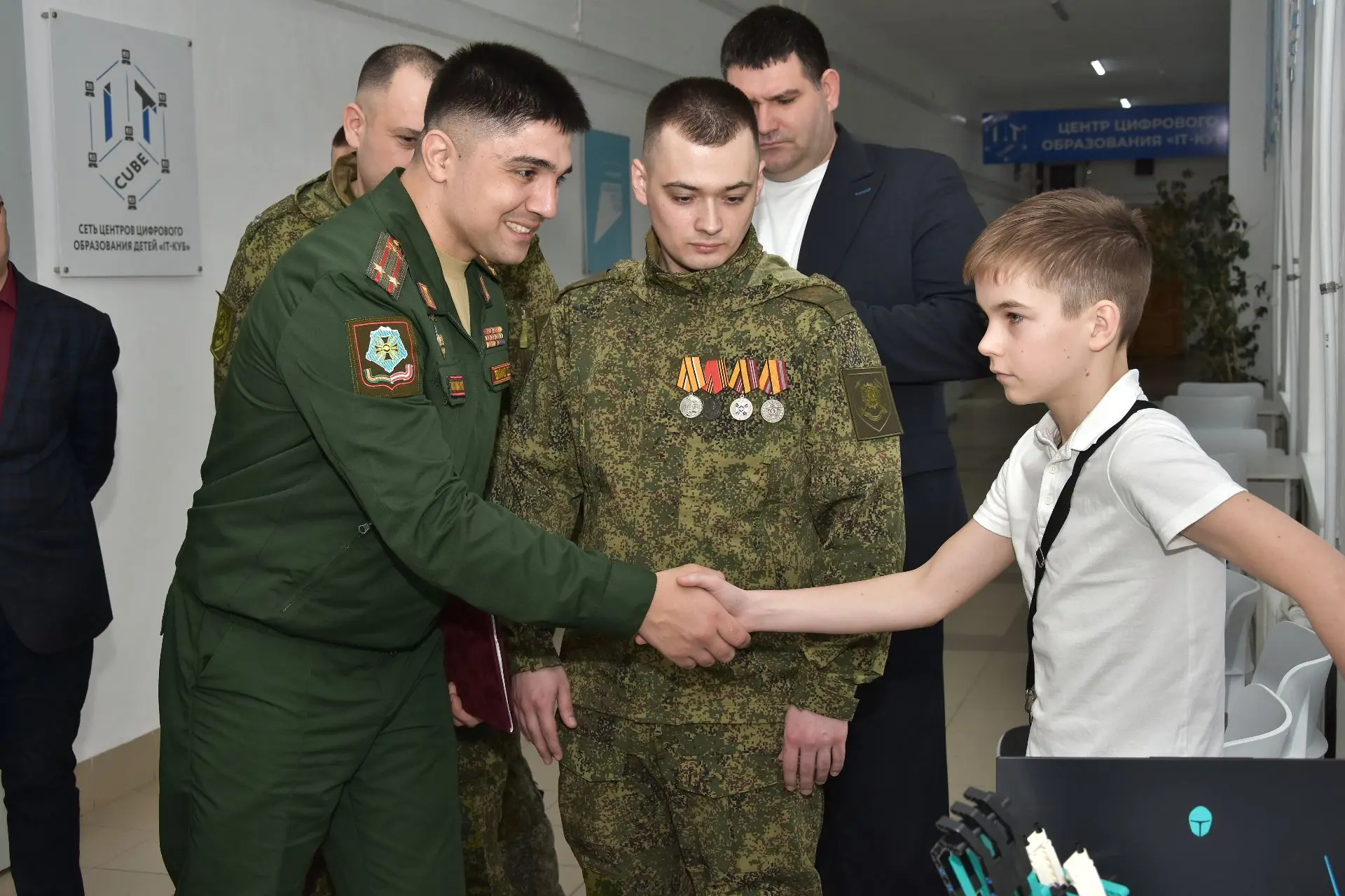 25 февраля 2026 года лицей принимал участников патриотической акции «Герой с нашего двора», организованной командованием ЮВО. Для школы было огромной честью принимать исполняющего обязанности заместителя командующего Южным военным округом по военно-политической работе подполковника Дереника Борисовича Темирханова и его соратников. Мы были безмерно рады, что этот визит был посвящен вручению выпускнику школы, начальнику радиостанции взвода связи ремонтно-восстановительного батальона, ефрейтору Артему Колмыкову медали «За боевые отличия» за отвагу и самоотверженность, проявленные при выполнении задач в боевых условиях и при проведении специальных операций в условиях, сопряженных с риском для жизни.