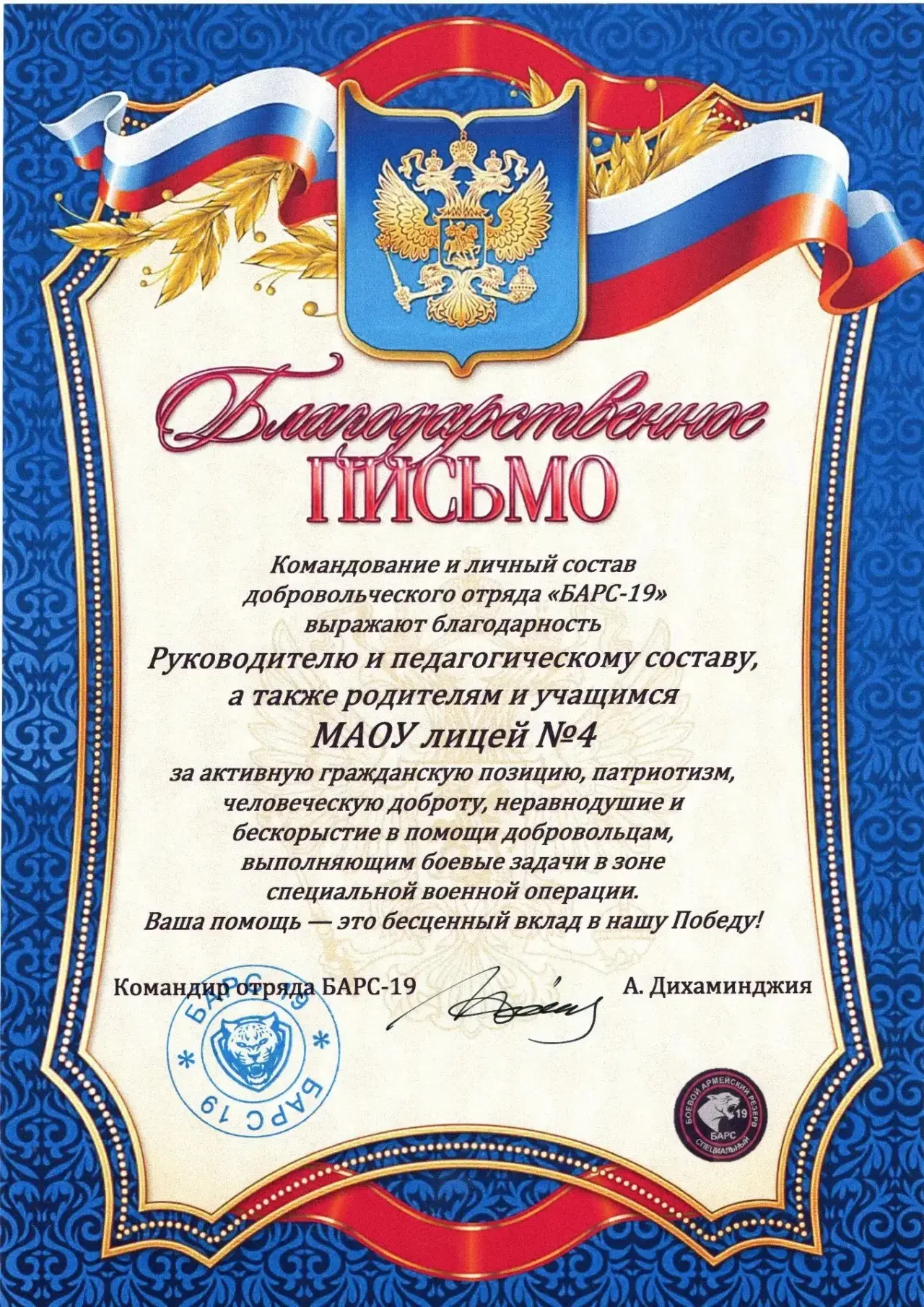 В нашем лицее завершился сбор гуманитарной помощи для казаков из добровольческих формирований «Барс». Мы говорим спасибо всему нашему дружному коллективу: руководителю , педагогам, учащимся и родителям!