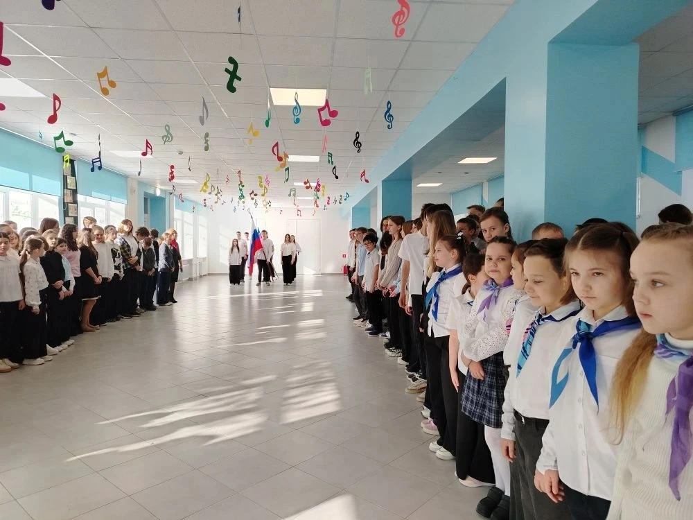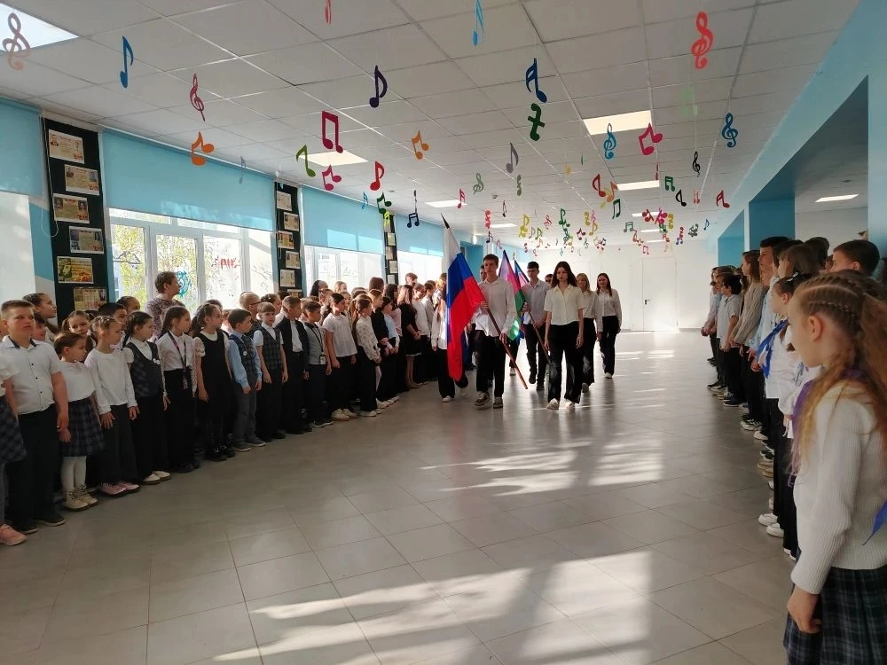 13 апреля, утро понедельника в школе традиционно началось с торжественной линейки: церемонии выноса флага и исполнения гимна Российской Федерации.