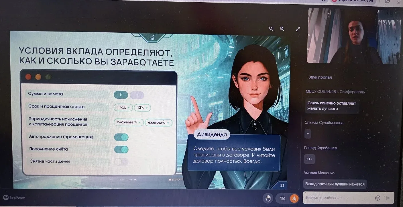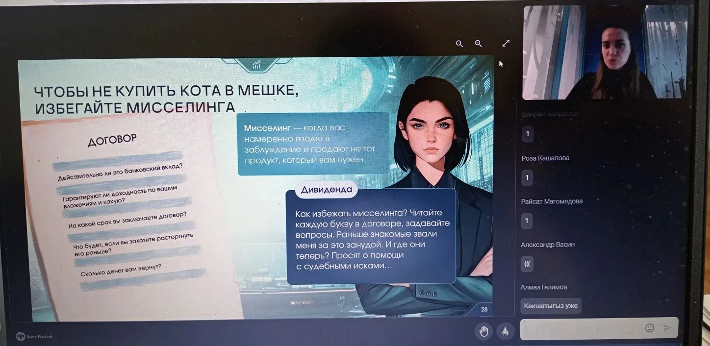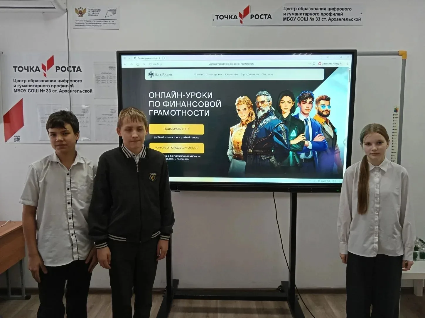 Проект "Онлайн -уроки по финансовой грамотности для школьников" . Учащиеся 6В класса МБОУ СОШ 33 ст. Архангельской приняли участие в мероприятии "С деньгами на" ты", или Секреты финансовой грамотности". Это образовательный вебинар для школьников, обучающий управлению личными финансами, созданию сбережений и защите от мошенников. Учащиеся научились ставить финансовые цели, вести бюджет, инвестировать и осознанно относиться к кредитам.
