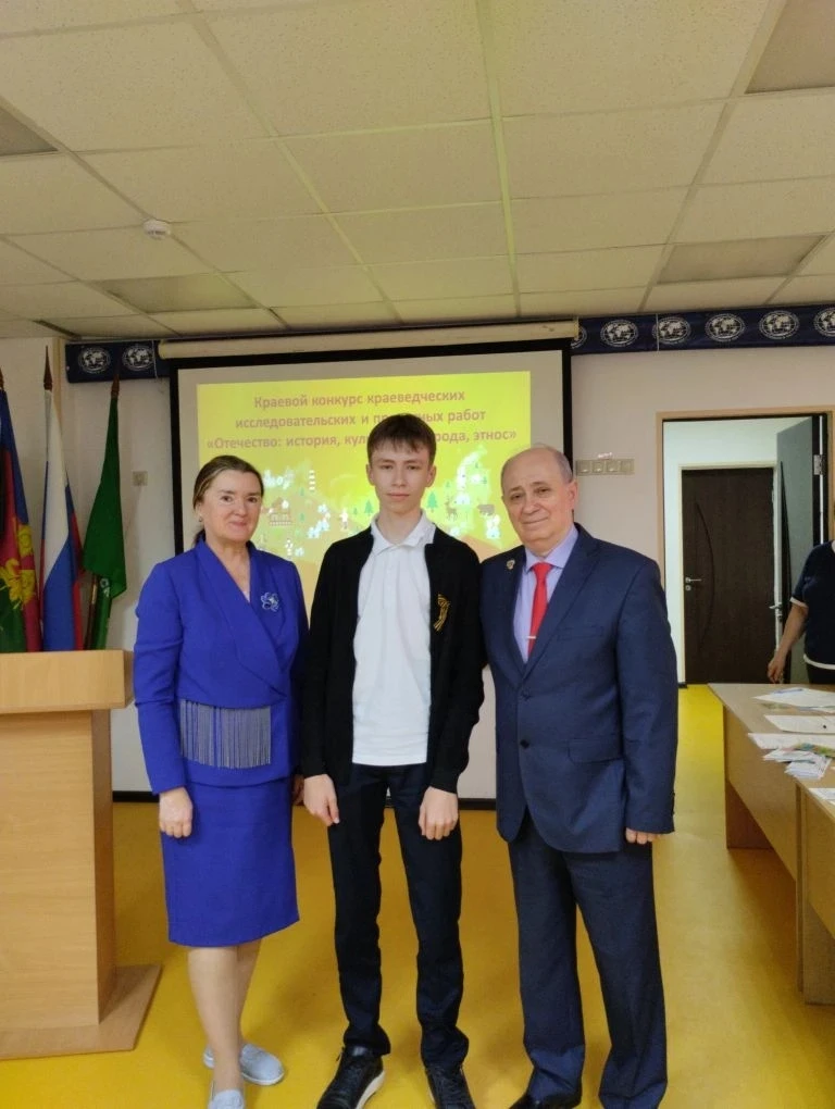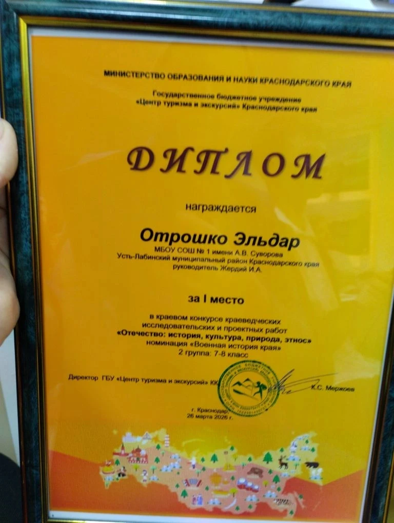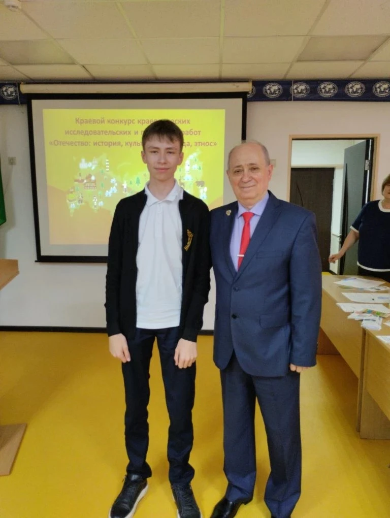 Сегодня наш ученик, Отрошко Эльдар из 8 «А» класса МБОУ СОШ № 1, блестяще выступил на региональном конкурсе «Отечество: история, культура, природа, этос» в Краснодаре!