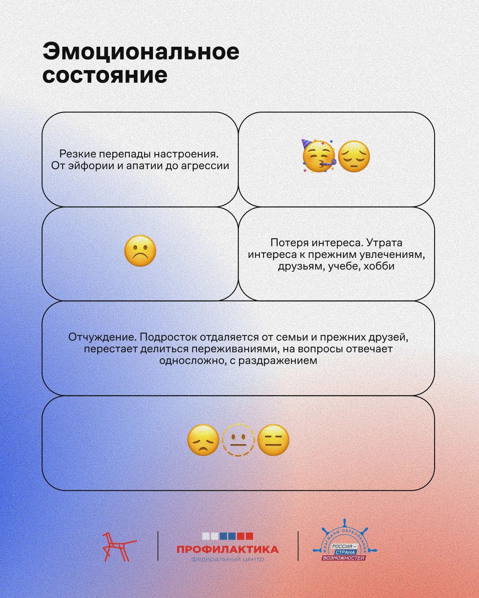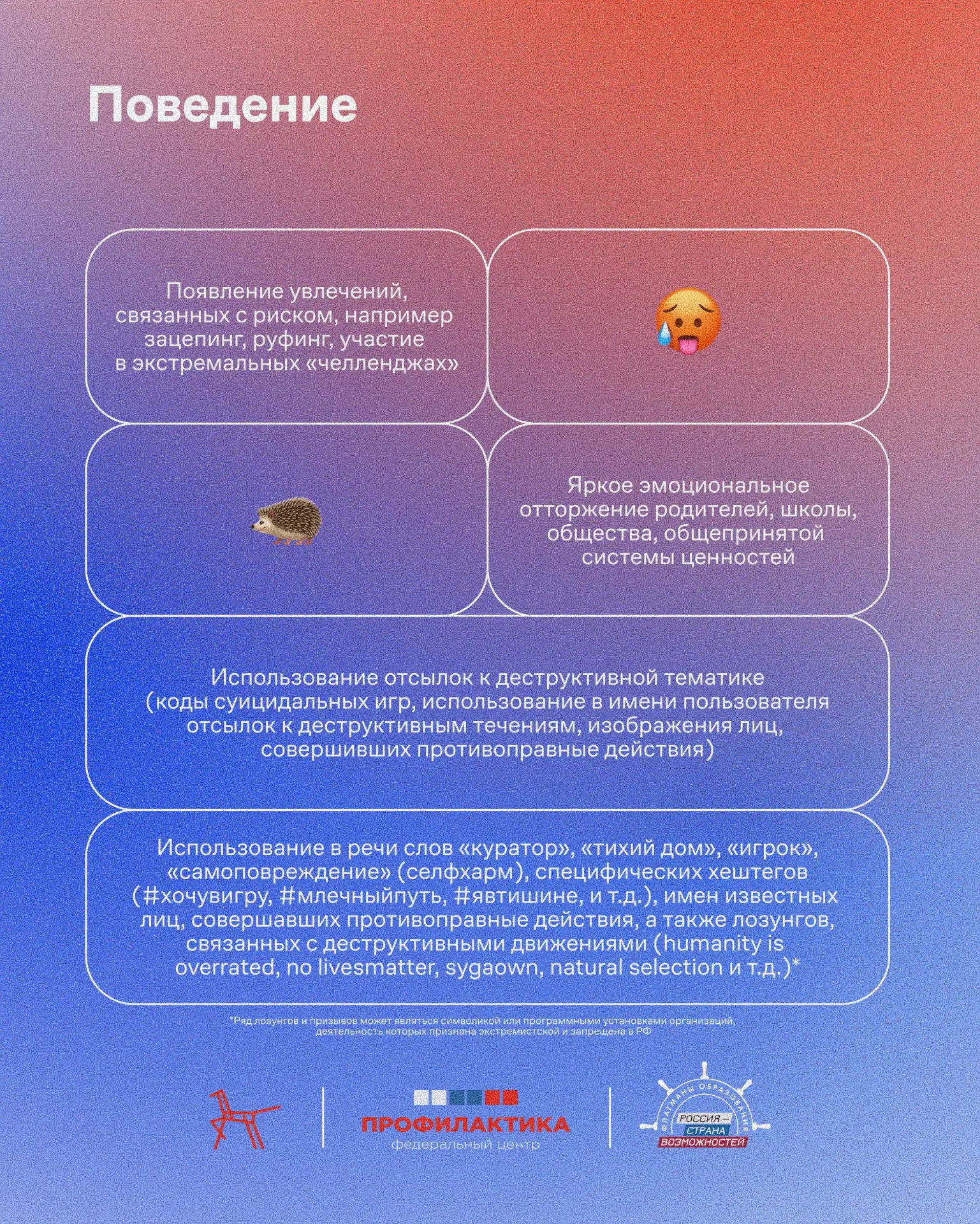Федеральный центр «Профилактика» подготовил материал, благодаря которому вы сможете вовремя заметить тревожные сигналы. В карточках собраны рекомендации, которые помогут вам распознать маркеры опасного поведения и понять психологические особенности ребенка, попавшего под влияние деструктивного контента.
