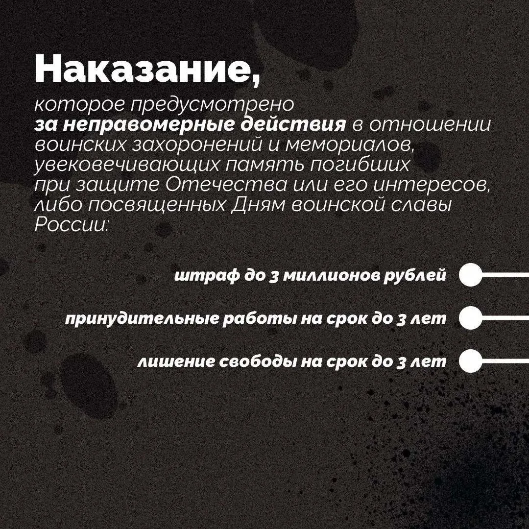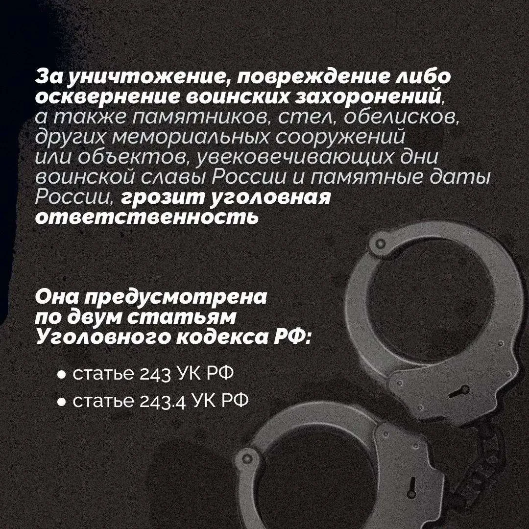 Также Евгений Наумов напомнил, что вандализм и осквернение памятников карается по закону, вплоть до уголовной ответственности. Подробнее об этом — в карточках.