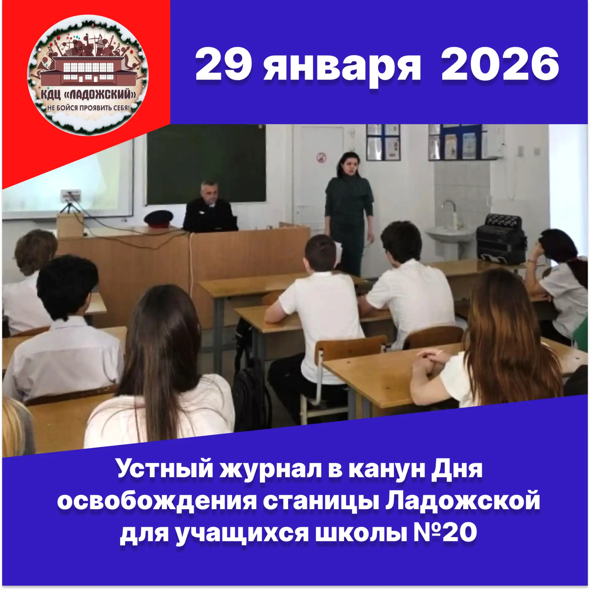 29 января 2026 года для учащихся школа №20 специалисты культурно-досугового центра «Ладожский» подготовили и провели познавательное мероприятие – устный журнал в канун Дня освобождения станицы Ладожской от немецко-фашистских захватчиков.