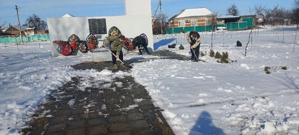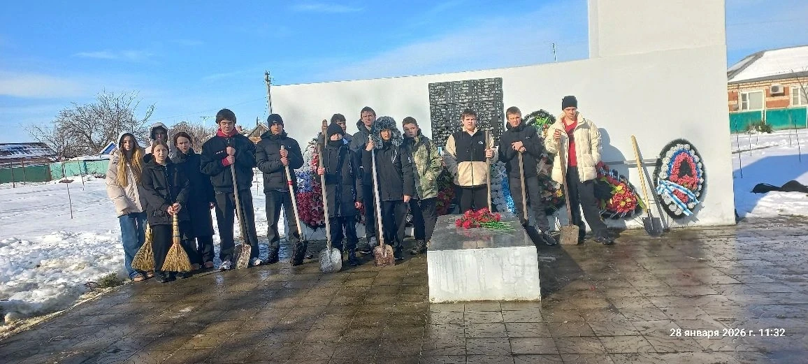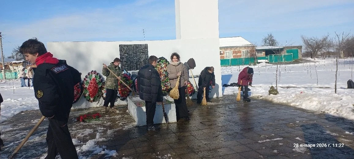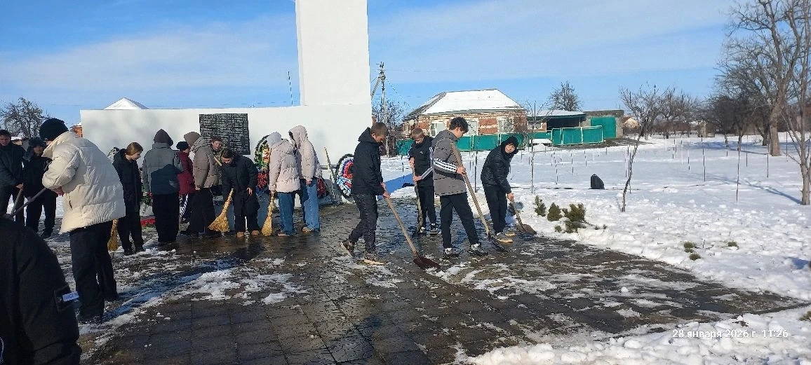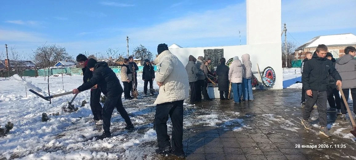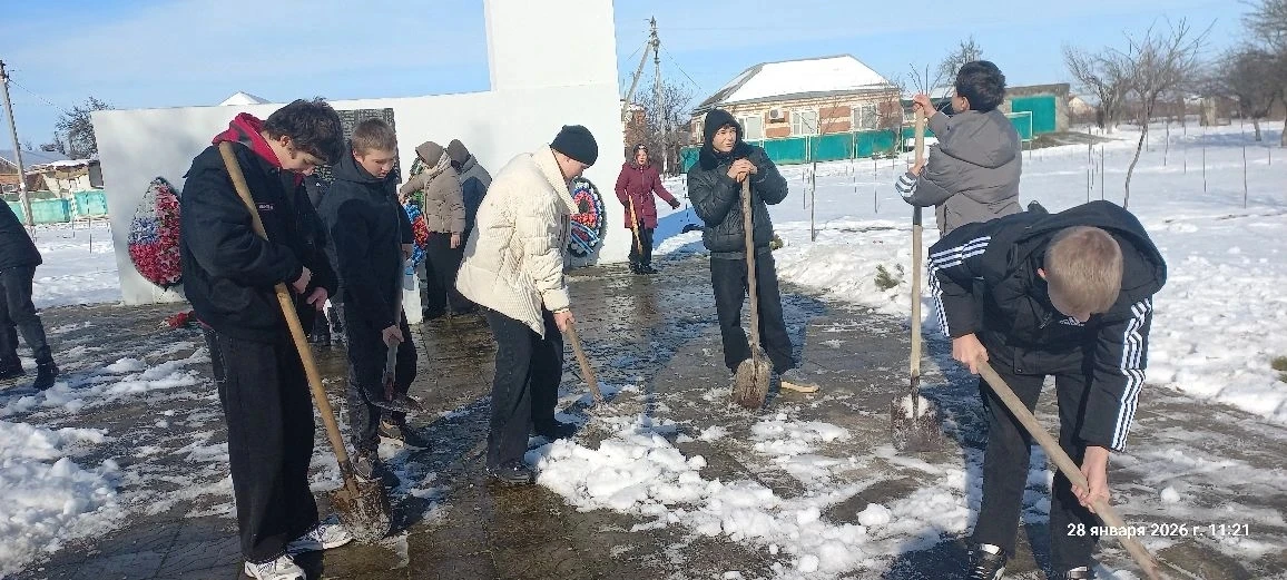 Сегодня учащиеся 8 «А» класса МБОУ СОШ 20 совместно с родителями провели субботник у памятника, посвящённого освобождению станицы Ладожской от немецко-фашистских захватчиков. Ребята очистили памятник от наледи, расчистили дорожку, убрали снег и сняли старые венки. Особая благодарность семье Астаховых, Скутневых, Бородаенко, Кузнецовых и Калугиных за активное участие и помощь. Этот труд — наша дань памяти и уважения погибшим при освобождении станицы. Спасибо всем, кто хранит историческую память и заботится о памятных местах.