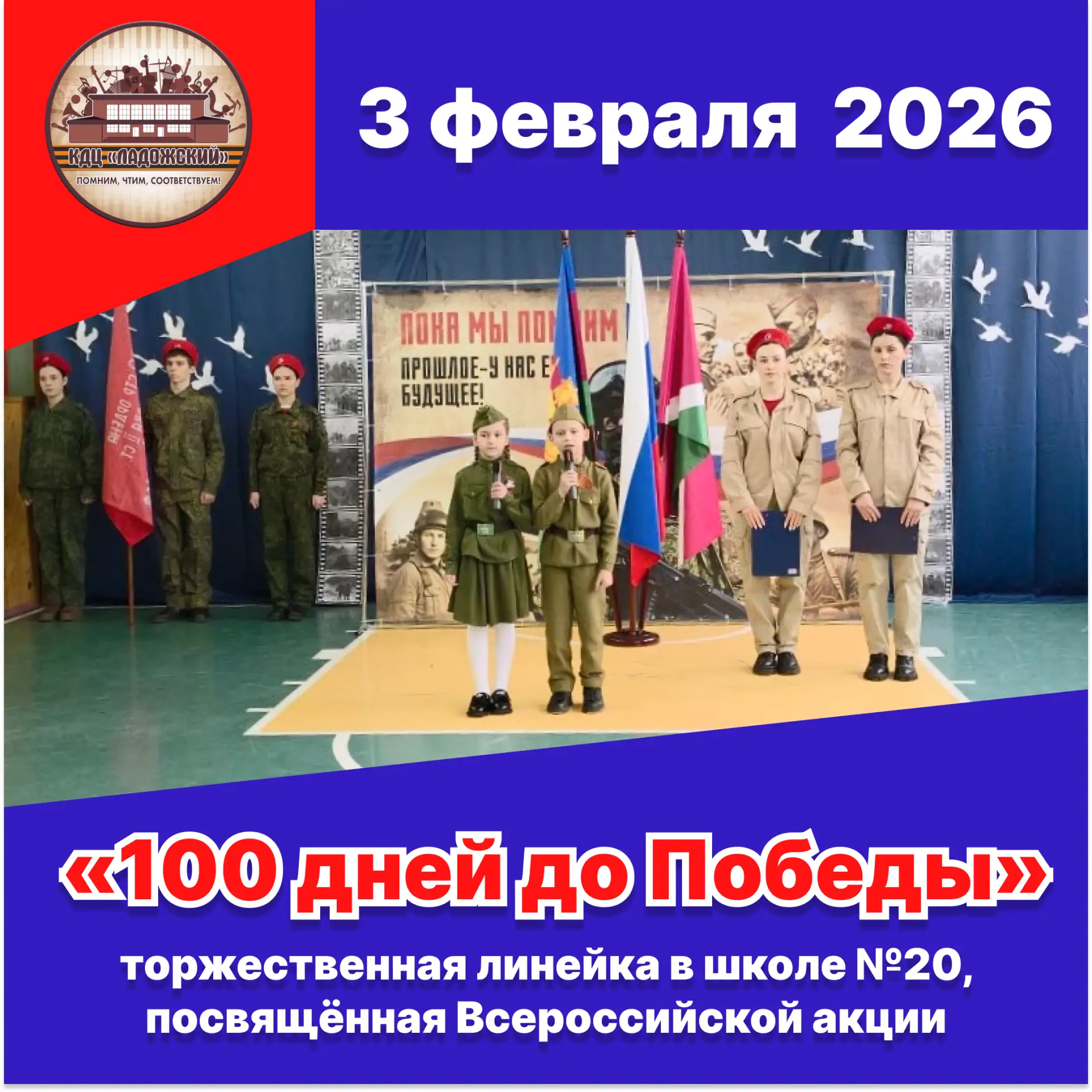 3 февраля 2026 года на базе школы №20 состоялась торжественная линейка, посвящённая Всероссийской акции «100 дней до Победы». В мероприятии приняли участие Атаман Ладожского хуторского казачьего общества, заведующий по патриотической работе и взаимодействию с казачеством культурно-досугового центра «Ладожский» - Быченко Вадим Викторович, полковник запаса ФСБ Мазаев Александр Васильевич, руководитель муниципального отделения союза казачьей молодежи Алексеев Николай Вячеславович и председатель совета ветеранов станицы Ладожской Белаш Лариса Васильевна.