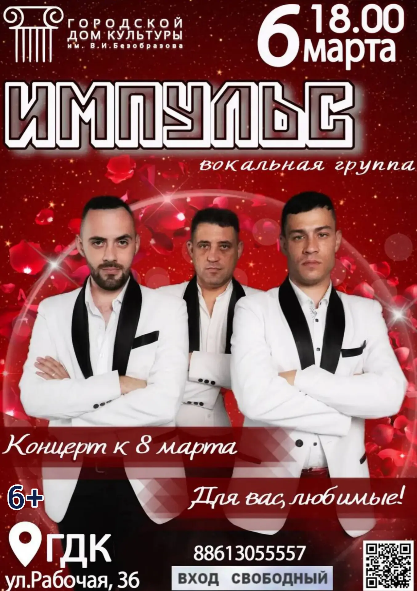 Вокальная группа «ИМПУЛЬС» приглашает всех жителей на свою программу «Для вас, любимые!». Артисты подготовили тёплую встречу, душевные песни и море весеннего настроения. Это музыкальное поздравление для прекрасной половины нашего города.