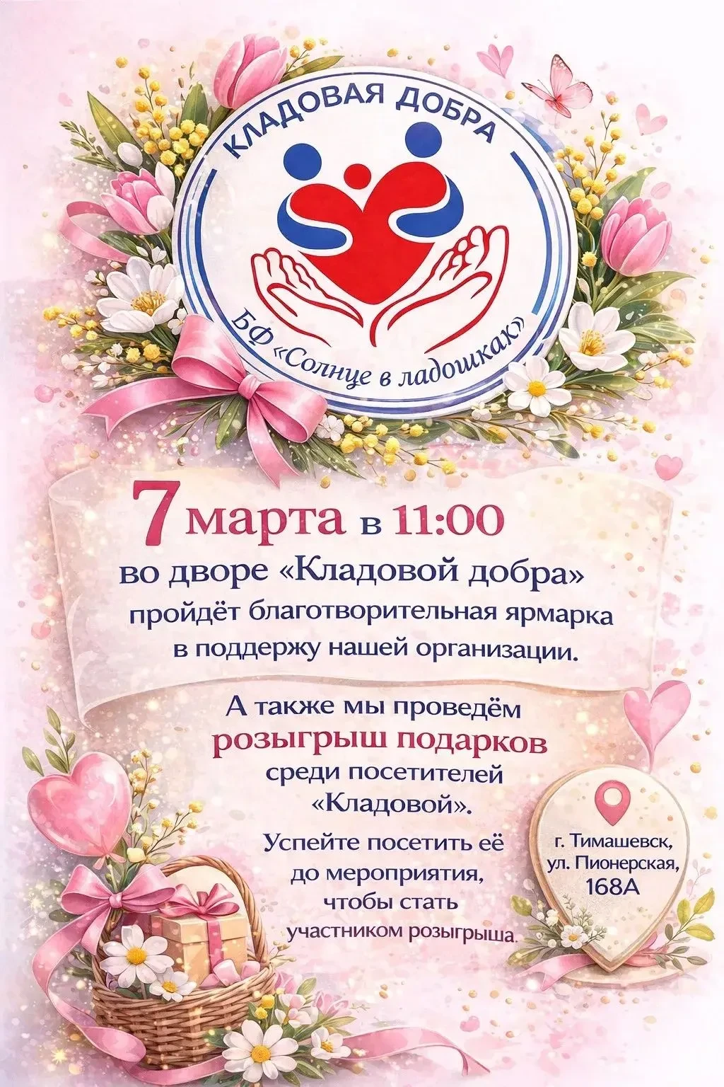 В субботу, 7 марта, в 11:00 во дворе «Кладовой добра» (г. Тимашевск, ул. Пионерская, 168А) пройдёт благотворительная ярмарка. Это отличная возможность не только найти что-то интересное, но и поддержать тех, кто нуждается в помощи.