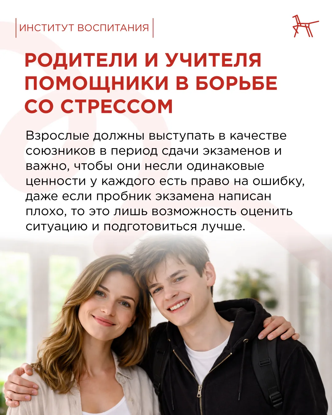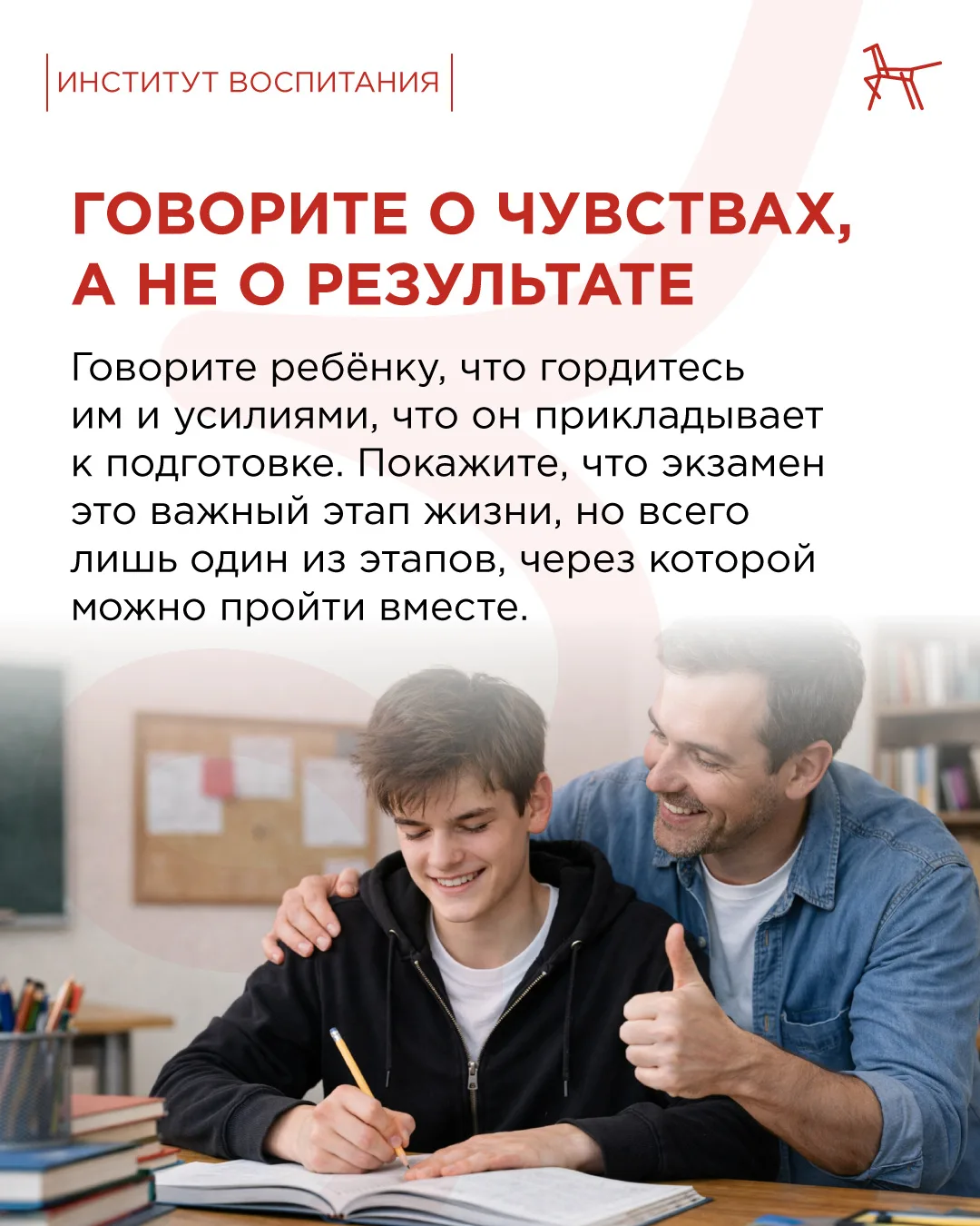 📌 Дети склонны сильно переживать. И в этот момент им как никогда нужен поддерживающий взрослый. Важно показать, что экзамены — один из этапов жизни.