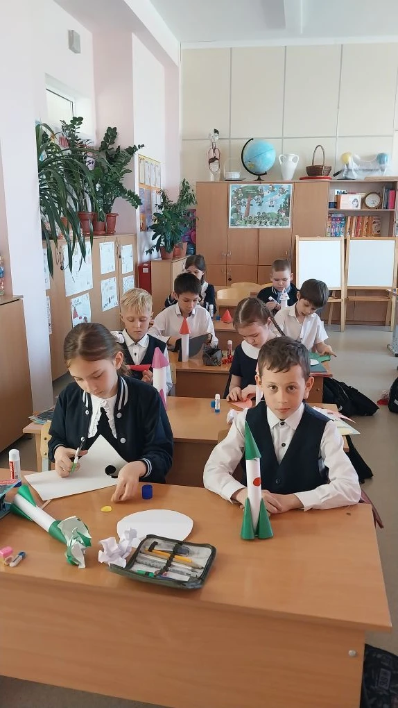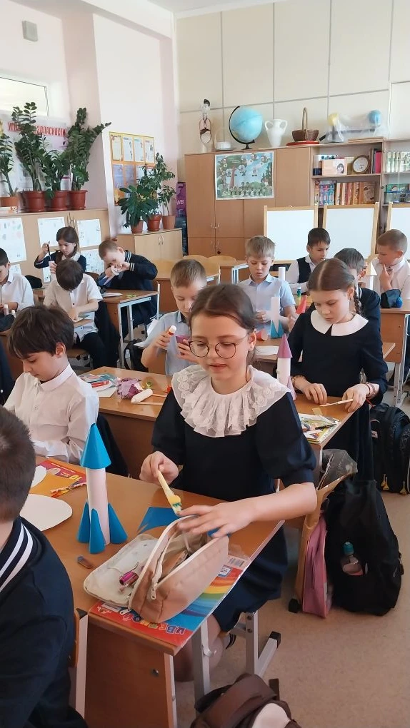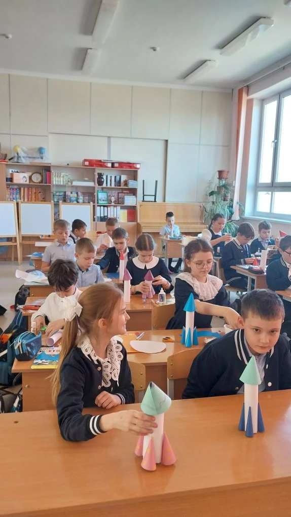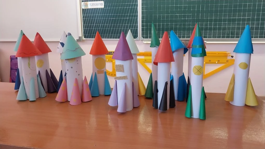 К 65 летию, в рамках недели космонавтики, на уроке труда учащиеся 3 А класса изготовили ракеты.