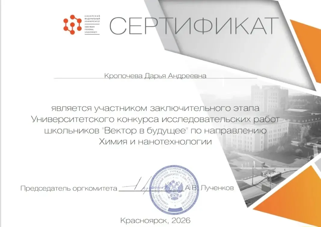 💫. Друзья, напоминаем о том, что Кропочева Дарья является призером конкурса СФУ «Вектор в будущее»‼️