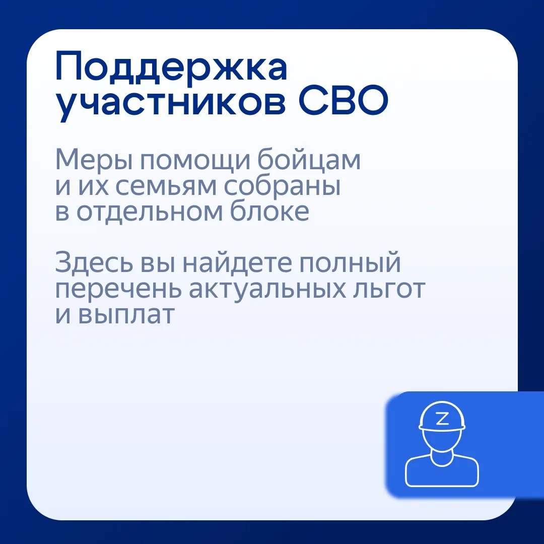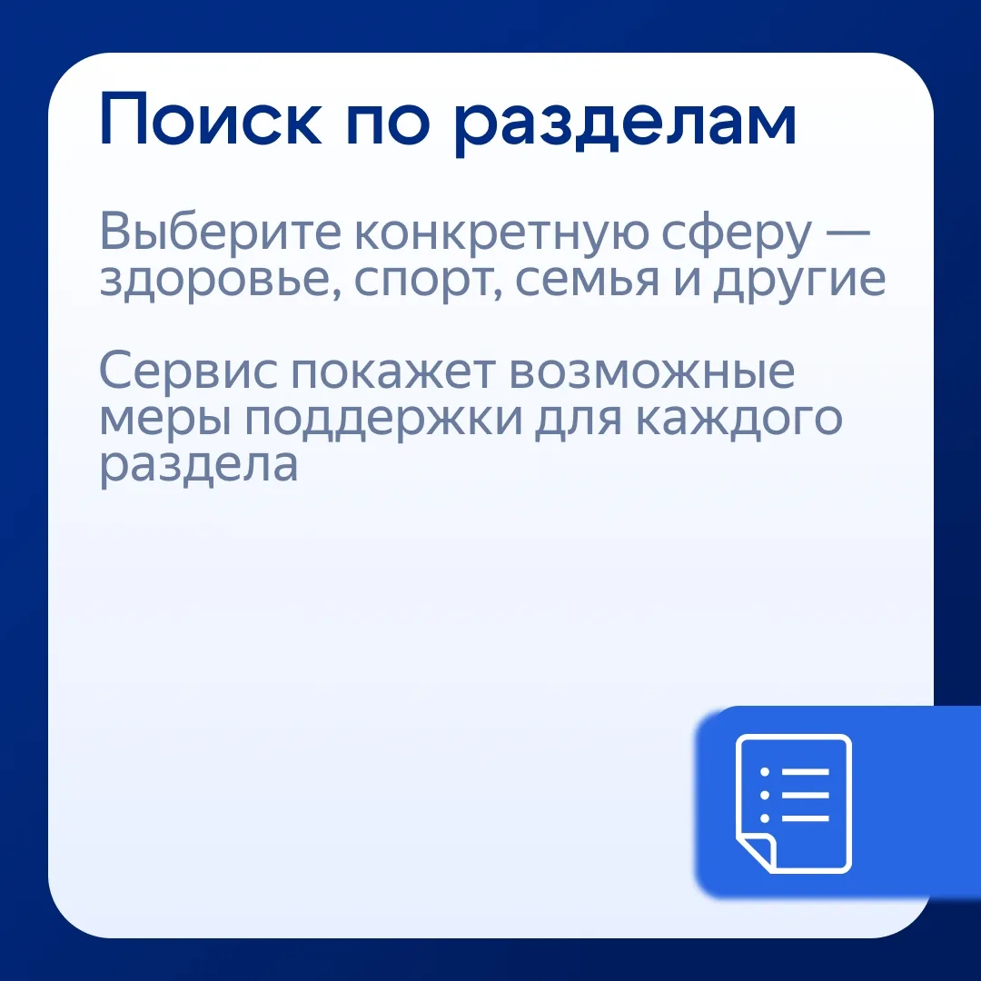 В каждой карточке указаны условия получения, список документов и контакты ведомств. Подать заявление можно сразу по прямой ссылке через Госуслуги.