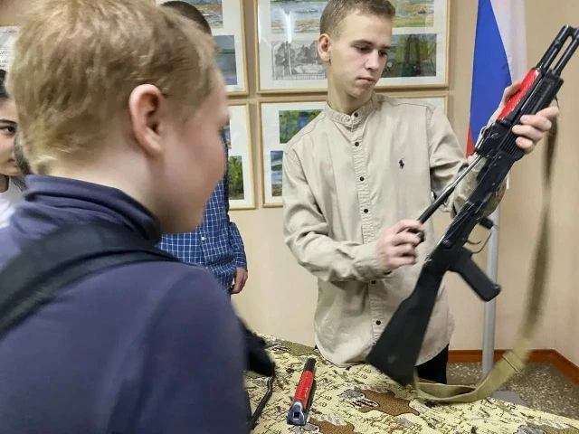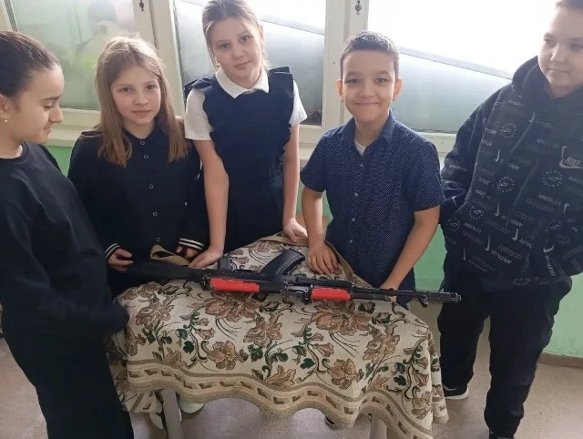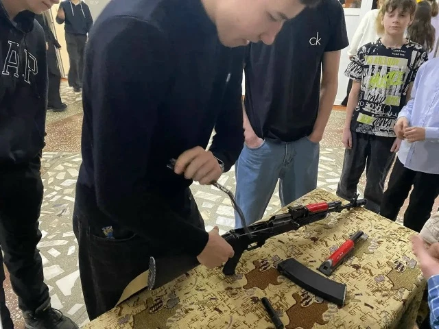Ребята обучали младших школьников разборке-сборке автомата Калашникова, снаряжению магазина патронами, надеванию боевой одежды пожарного и т.д.
