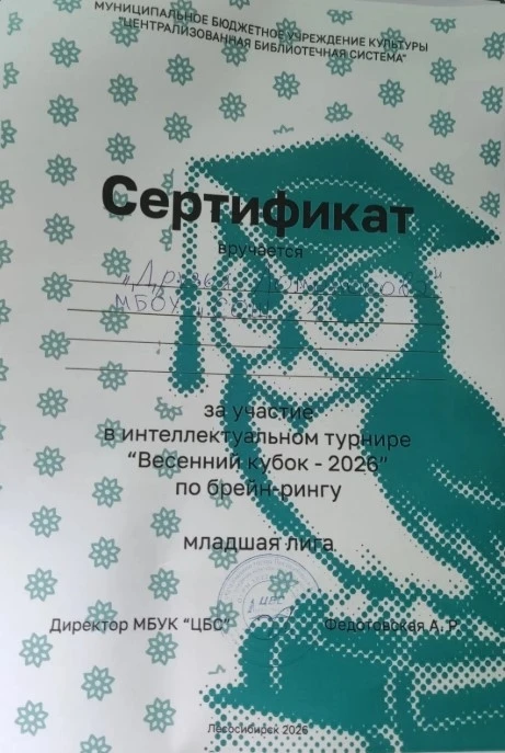 По итогам турнира команда награждена сертификатом участника финальных интеллектуальных состязаний.