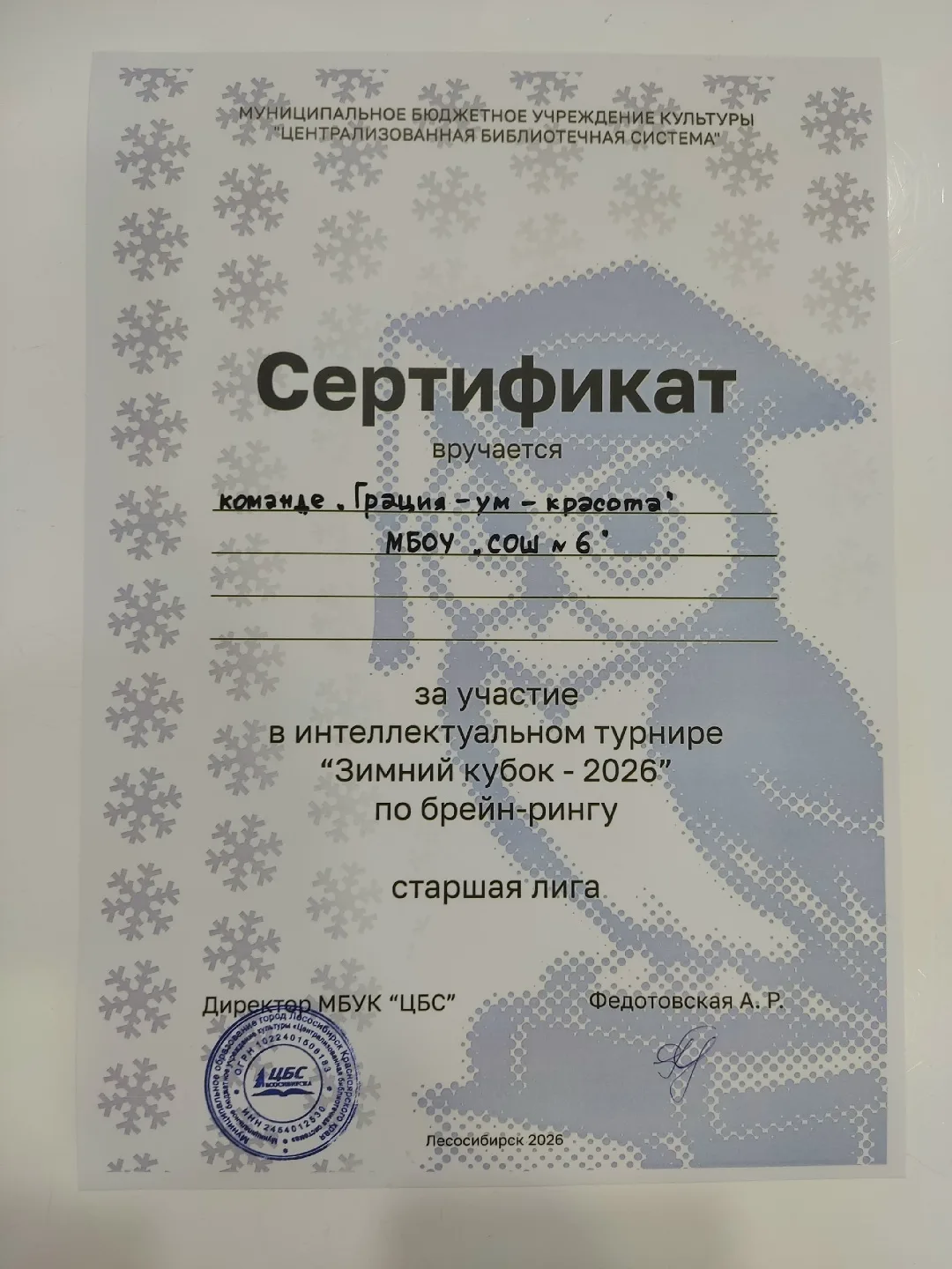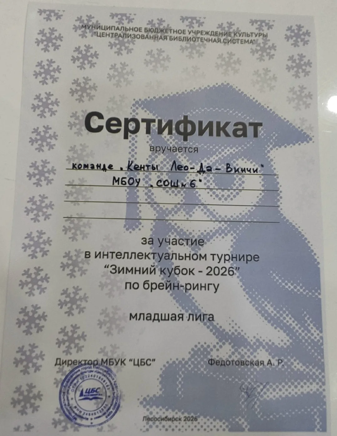 Команда нашей школы "Кенты Лео-Да-Винчи" получила сертификат за участие, заняв 6-е место по количеству набранных баллов за игру среди 9 команд всех общеобразовательных учреждений города Лесосибирска.