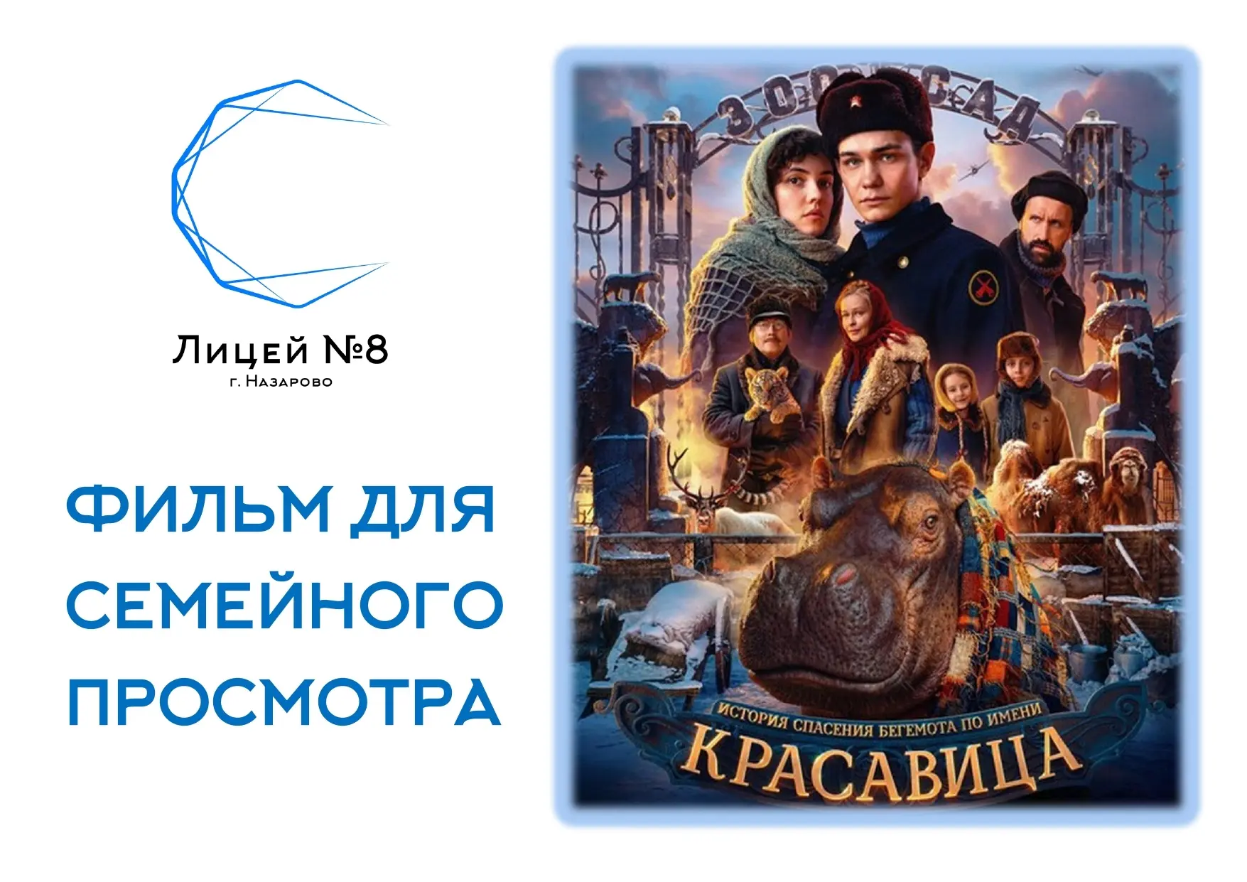🎬 Предлагаем провести предстоящие выходные за просмотром фильма Антона Богданова «Красавица» (12+), в котором рассказывается о силе духа в самое страшное время. Картина основана на блокадной хронике Ленинградского зоопарка и истории выживания бегемотицы Красавицы 🦛