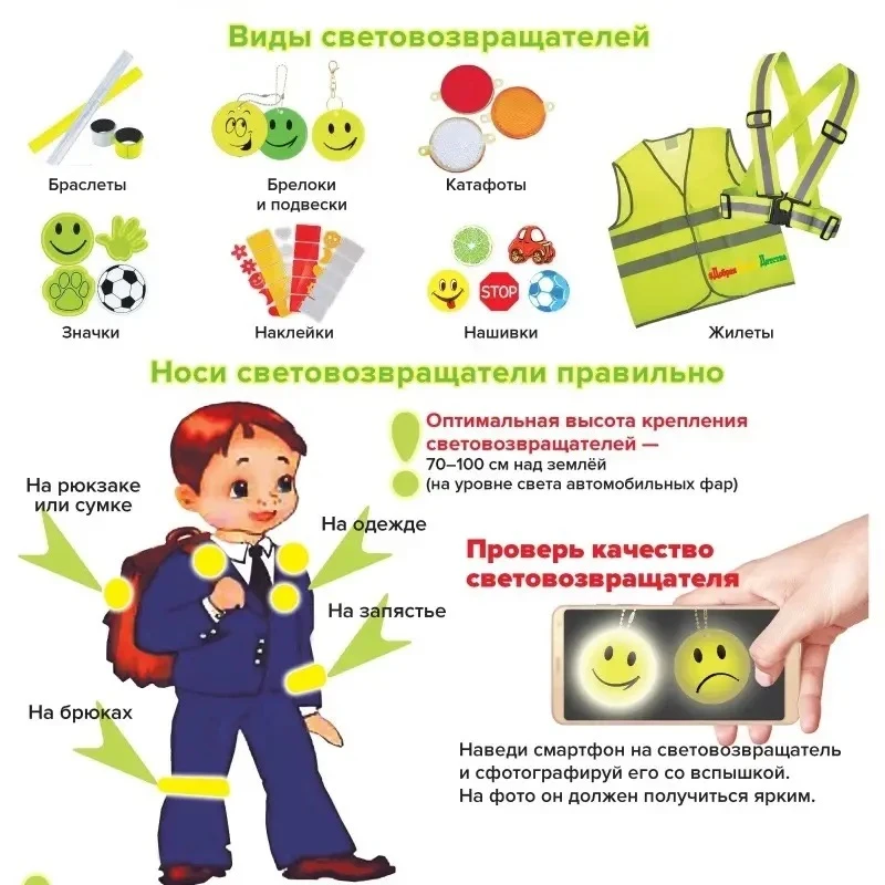 СВЭ в обязательном порядке должны присутствовать у детей на одежде, рюкзаке, сумке, поясе, других предметах, они различаются по видам: