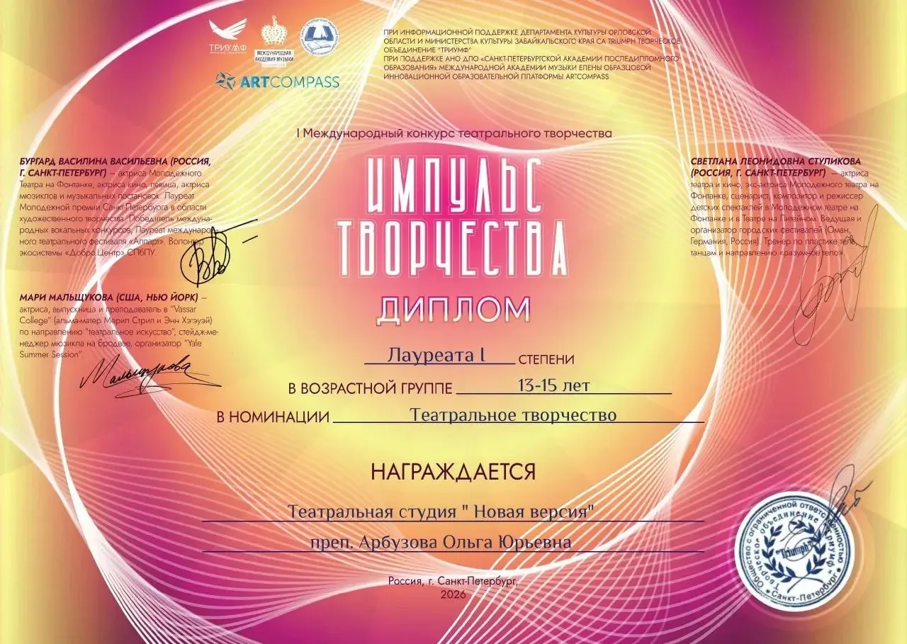 🎉 Поздравляем артистов и руководителя театральной студии Ольгу Юрьевну Арбузову с победой! Желаем не останавливаться на достигнутом, верить в себя и покорять новые творческие вершины.