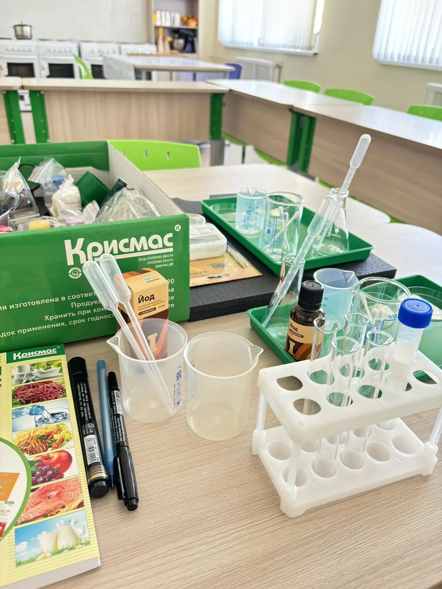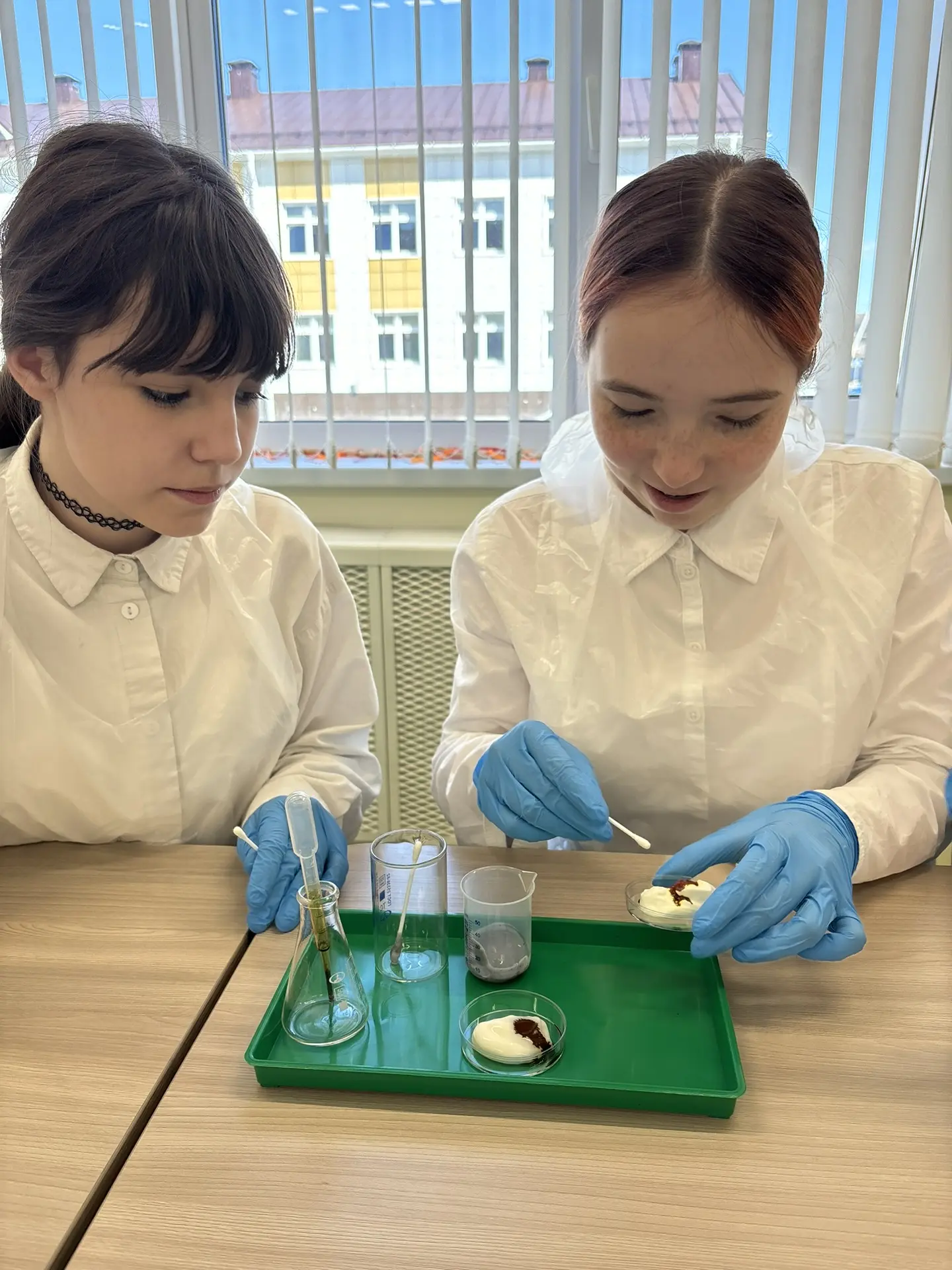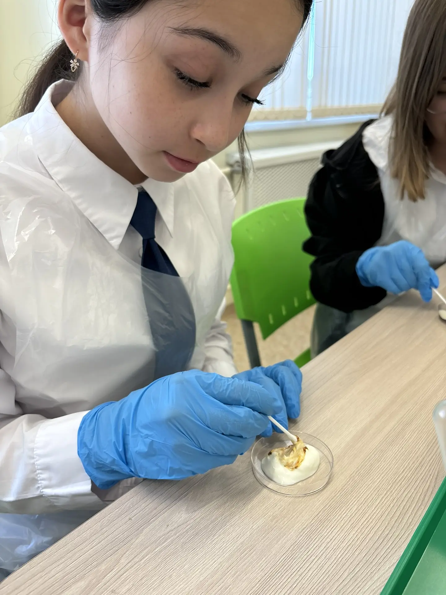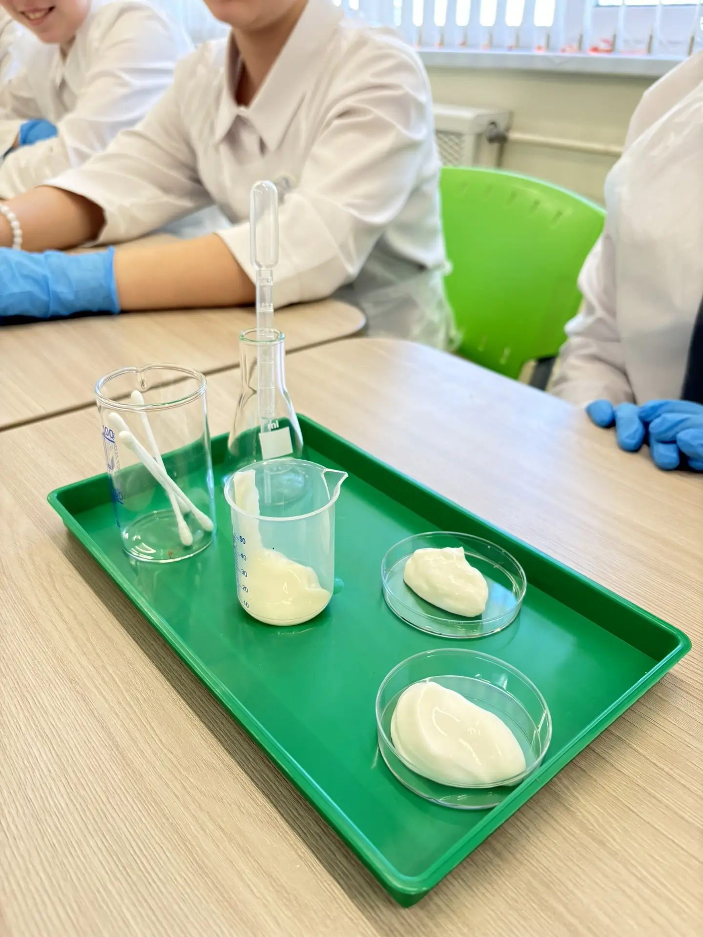 Сегодня, в рамках недели труда (технологии), под руководством учителя Лукмановой Е.И. ученицы 6И класса провели лабораторную работу по определению примесей крахмала в сметане с использованием раствора йода.