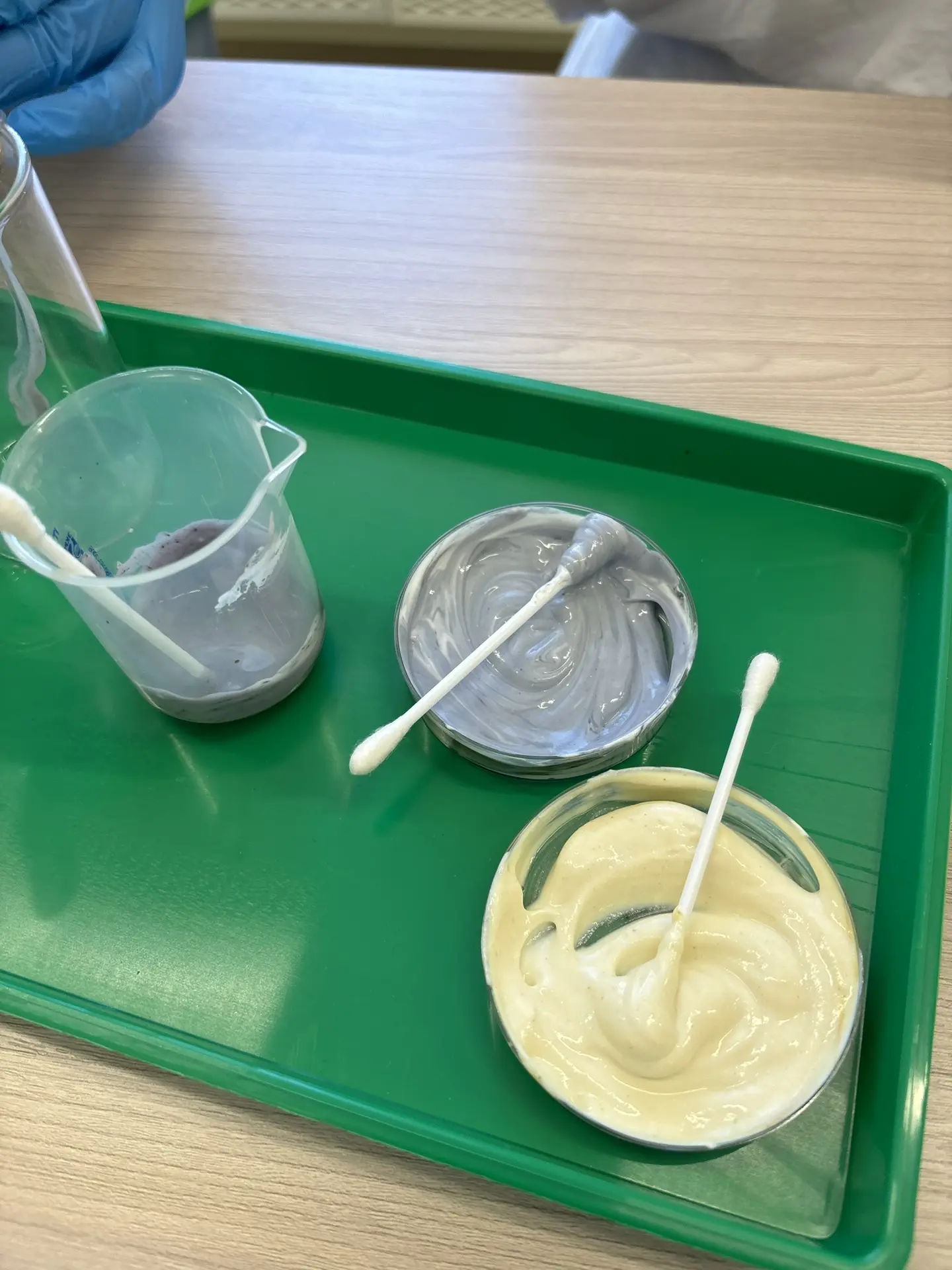 Сегодня мы научились определять примеси крахмала в двух видах сметаны и йогурта. Взяв каждый образец, соединили его с раствором йода и перемешали ватной палочкой. Результат показал, что два из трёх образцов содержали крахмал: сметана под номером 1 и йогурт окрасились в синий цвет, что свидетельствует о большом количестве крахмала. Сметана под номером 2 оказалась натуральной.
