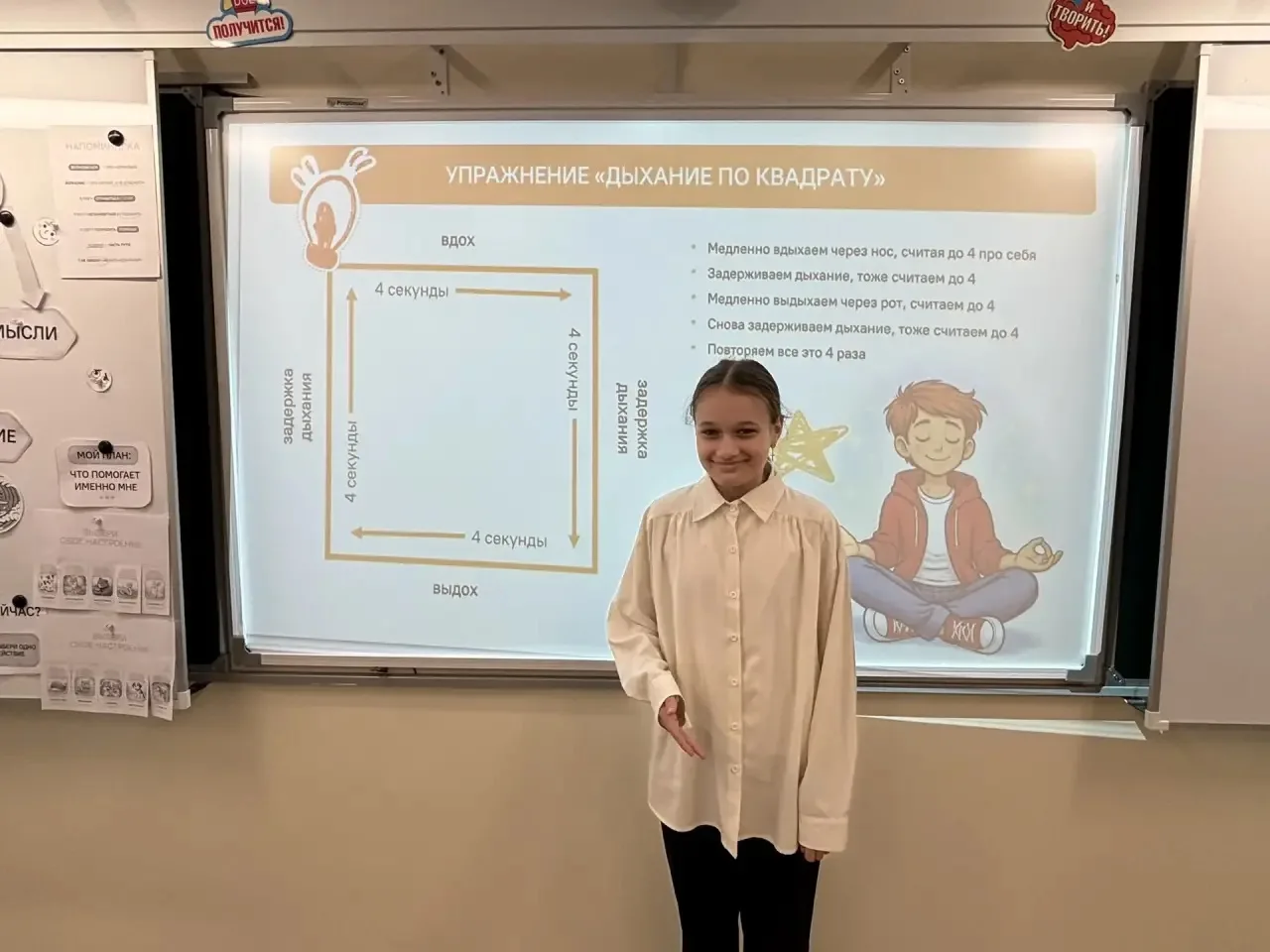 Мы начали с упражнения «Дыхание по квадрату», которое помогает успокоиться и сосредоточиться. Вот как это работает: