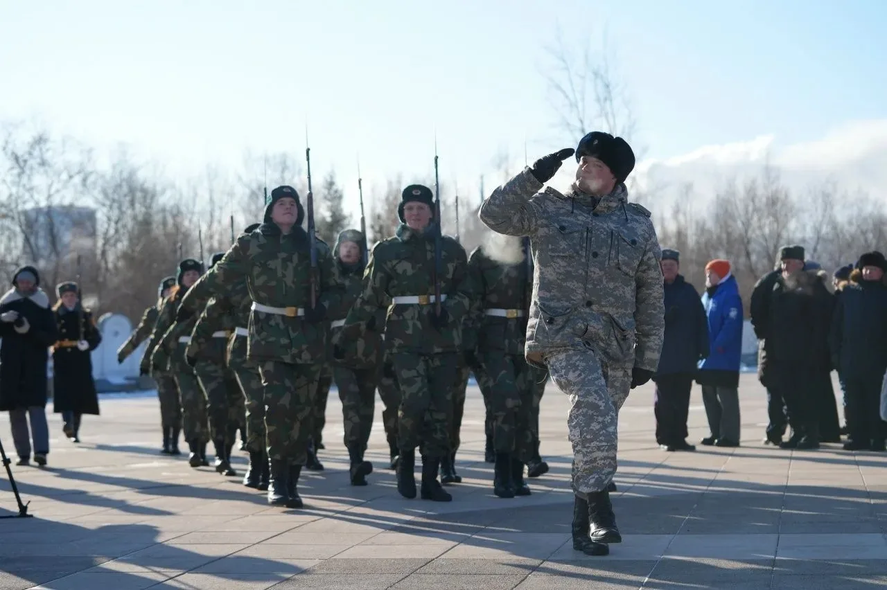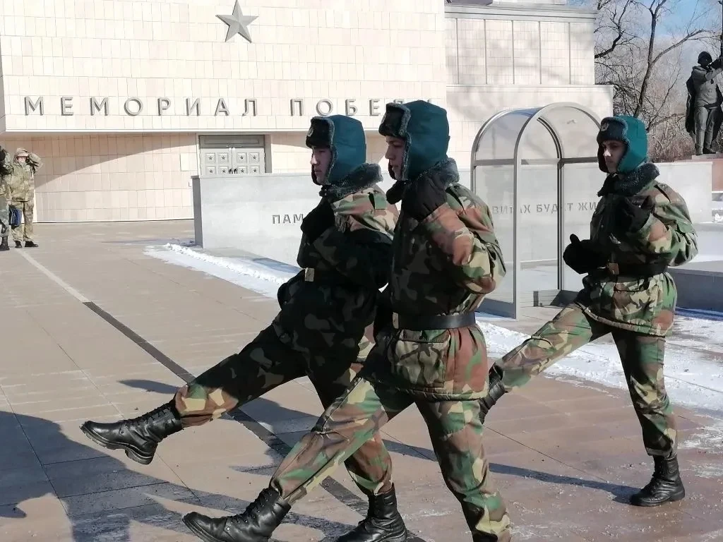 Известная поговорка, отражающая тренировки на Посту Nº1 Почетного караула Гимназии Nº14, которые прошли 19 февраля 2026 года на площади Победы.