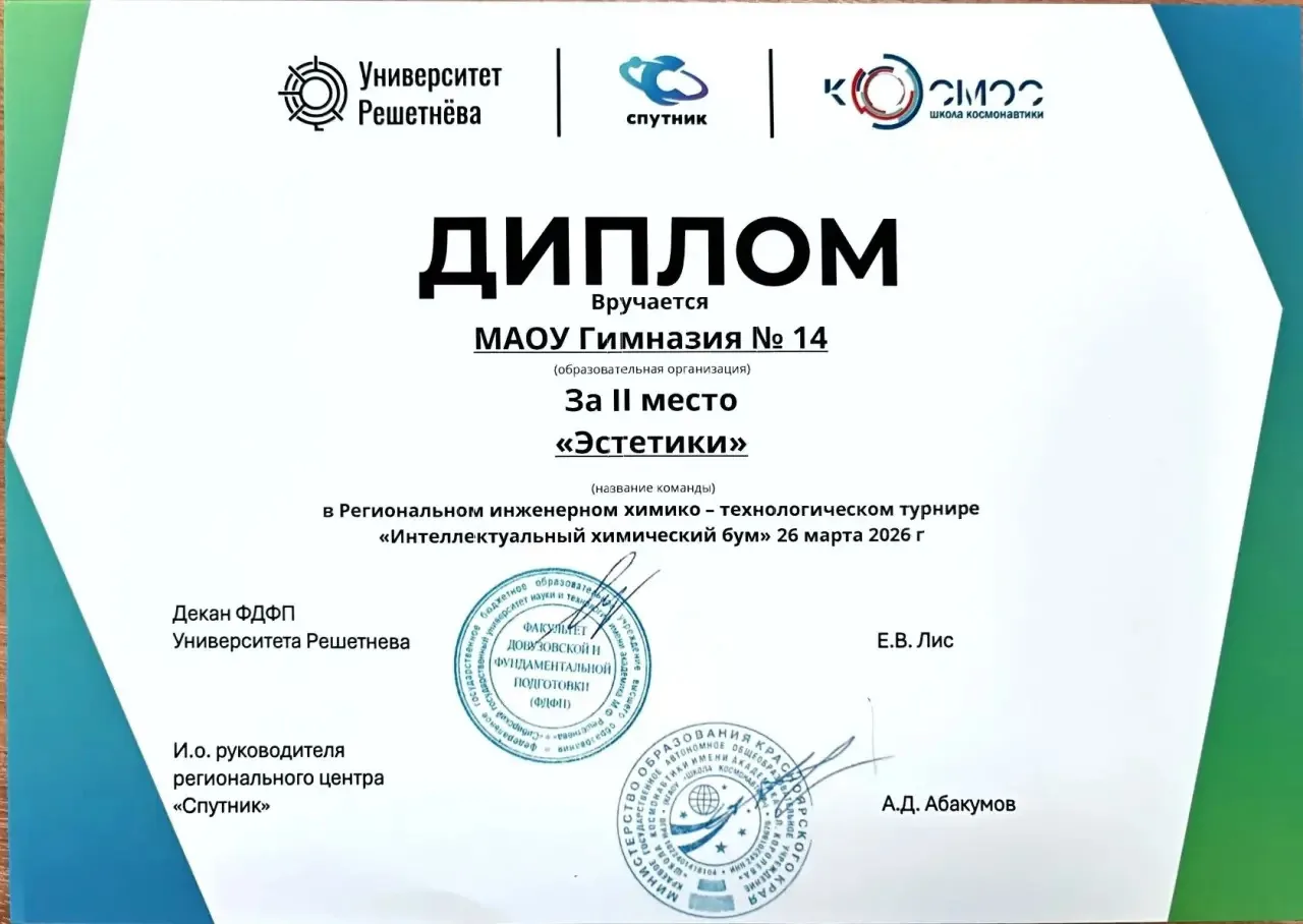 26 марта в Университете Решетнева прошел Региональный инженерный химико-технологический турнир «Интеллектуальный химический бум». На турнире Гимназию представляли обучающиеся 11А класса. Команда «Эстетики» заняла 2 место в турнире. Поздравляем!!!