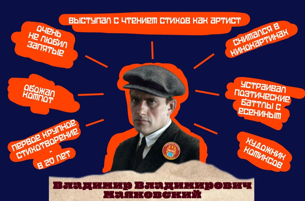 👉🏽Четверг - самое время открыть для себя Владимира Маяковского, поэта‑бунтаря, который перевернул представление о стихах и искусстве в целом. Он был не только гениальным поэтом, но и талантливым дизайнером, азартным игроком и настоящим модником‑провокатором - достаточно вспомнить его знаменитую жёлтую кофту!