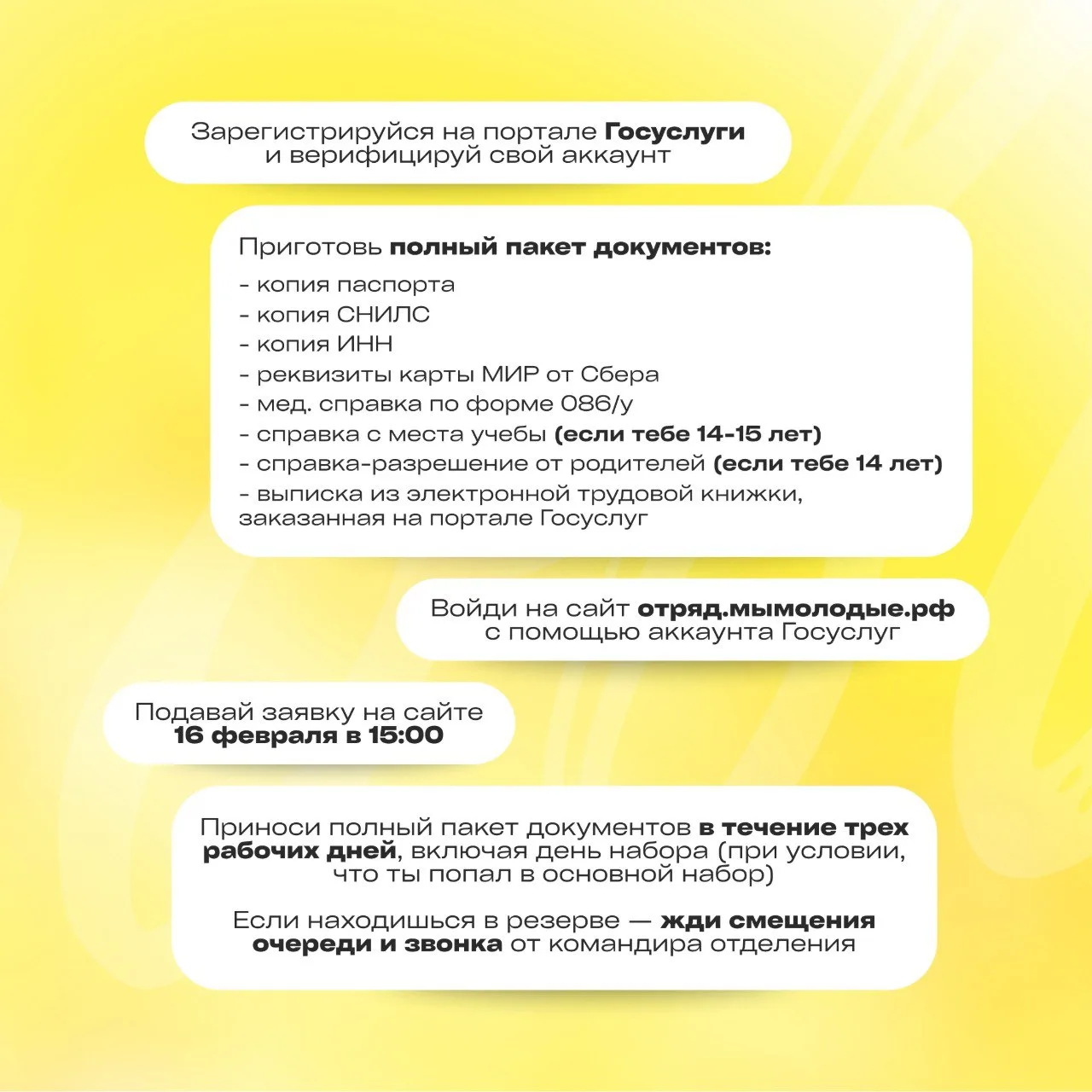 ✅Если вы в основной очереди — приходите с документами 16, 17 или 18 февраля;