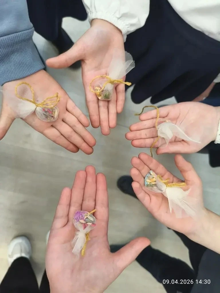 Вместе с младшими школьниками они делали «Талисман для космонавта» — маленький мешочек, в который сложили самые настоящие атрибуты Земли: