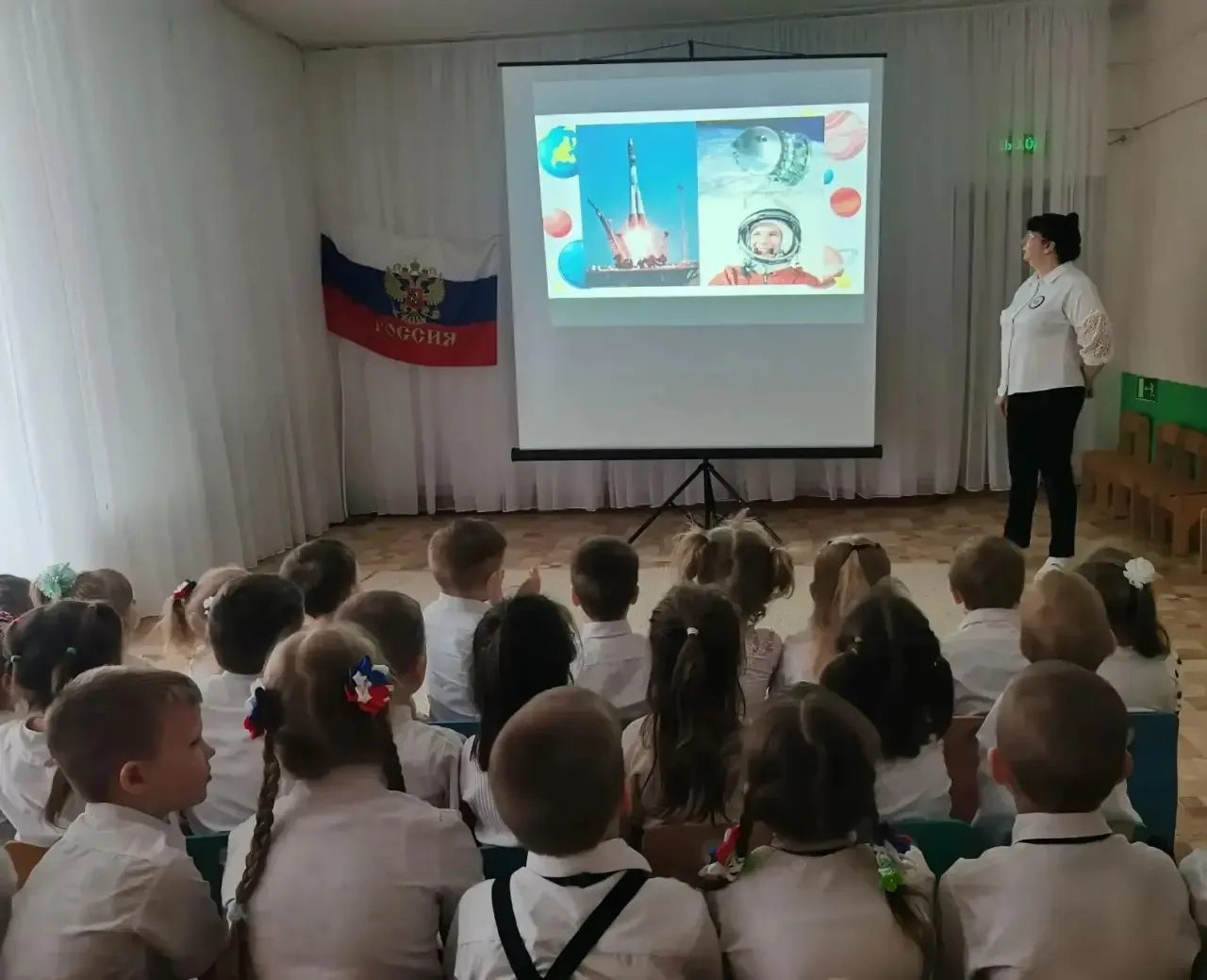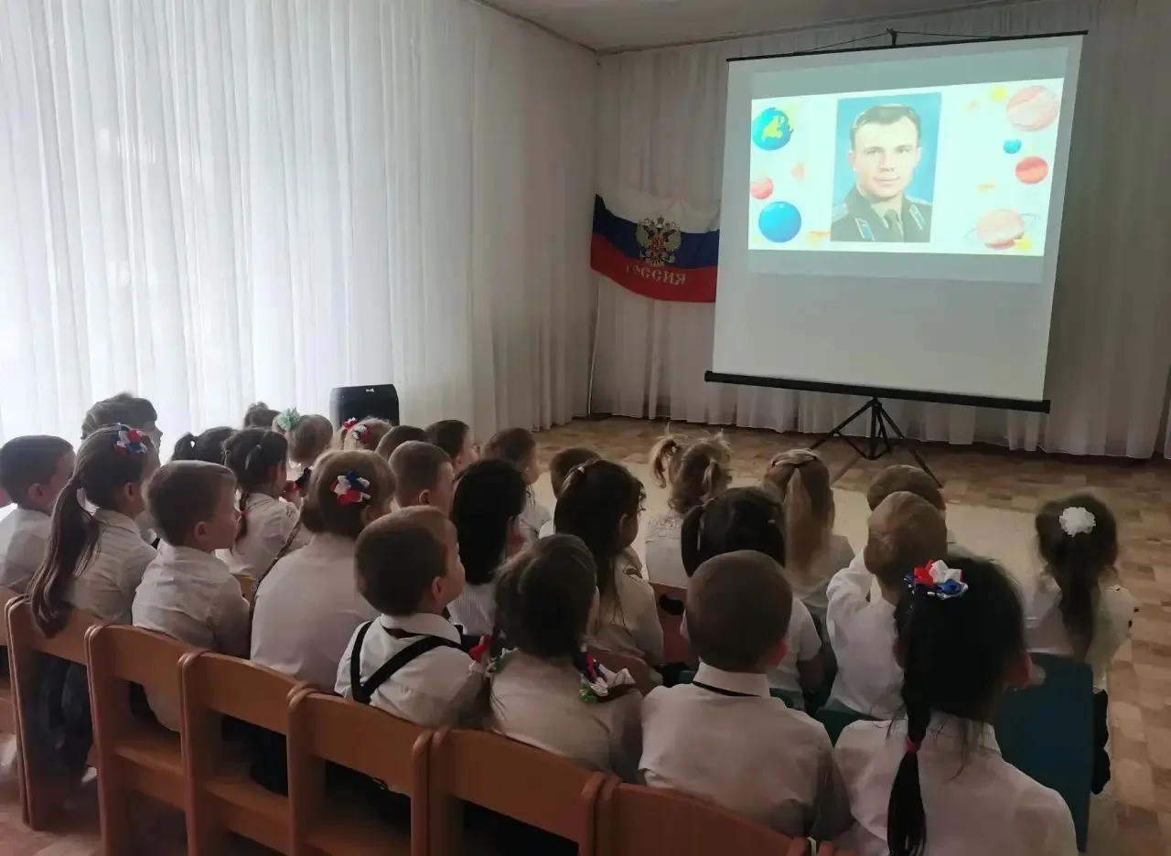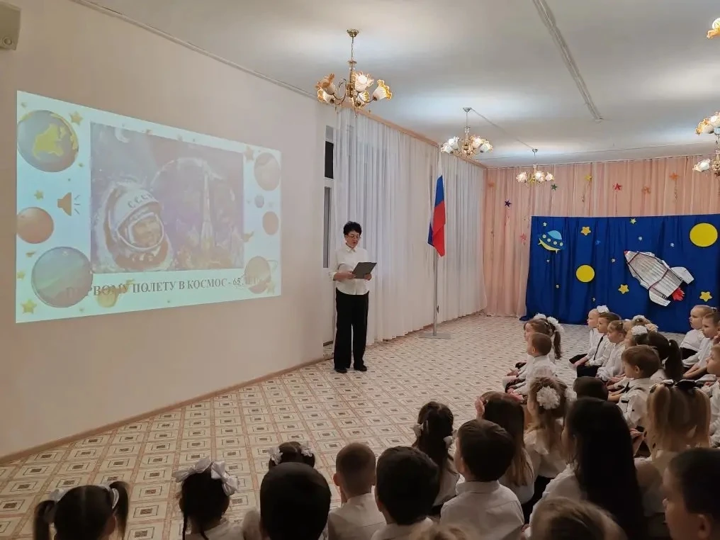 Неделя началась с торжественной линейки, на которой педагоги рассказали о первом полёте человека в космос.