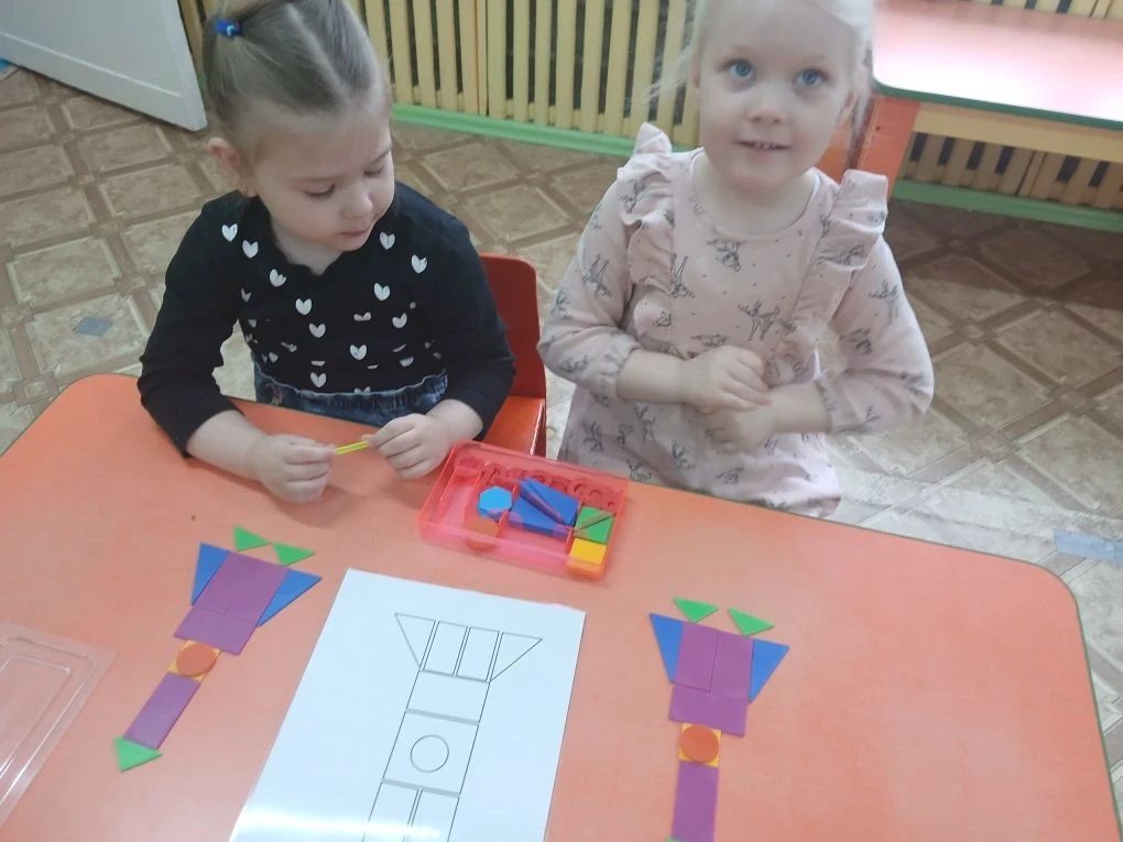 На занятии по рисованию дети раскрасили ракеты, а на занятии по конструированию построили ракеты из строительного материала, поиграли в игру " Солнышко и дождик ".