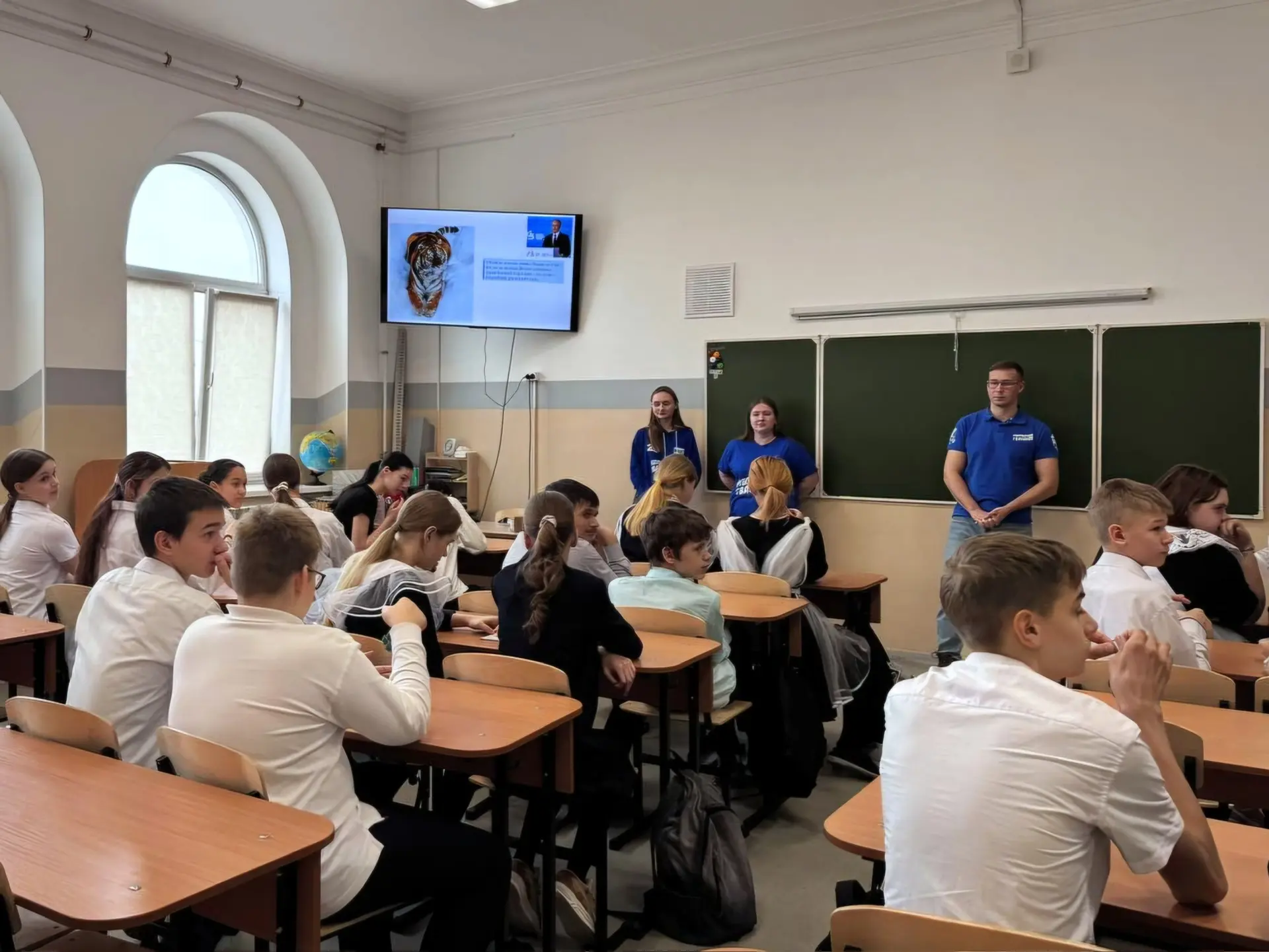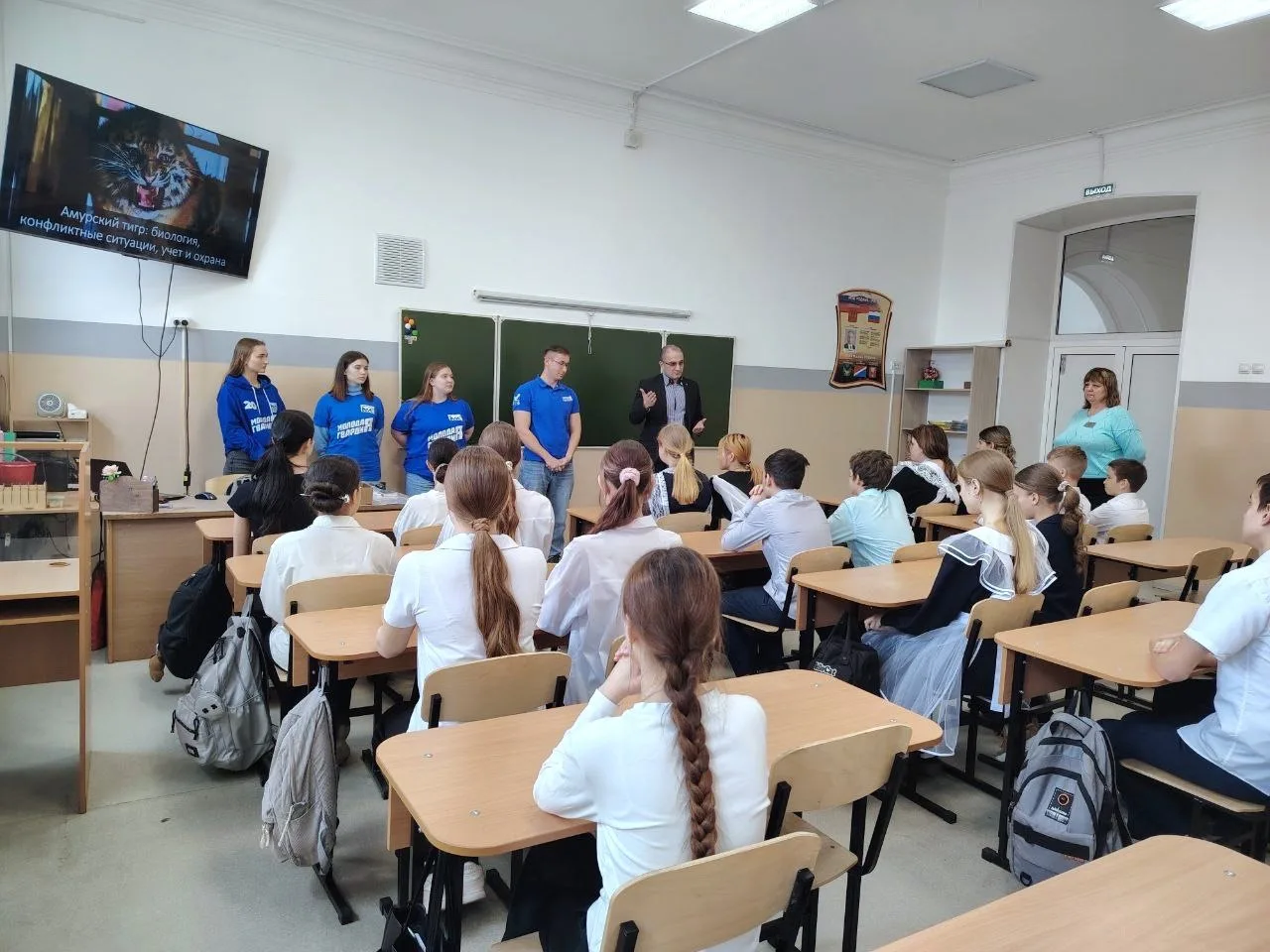Школьники узнали о биологии хищника, проблемах конфликтов с человеком, посмотрели уникальные кадры с фотоловушек и завораживающие видео выпуска тигров после реабилитации. Вся информация – из первых рук, от студентов-охотоведов.