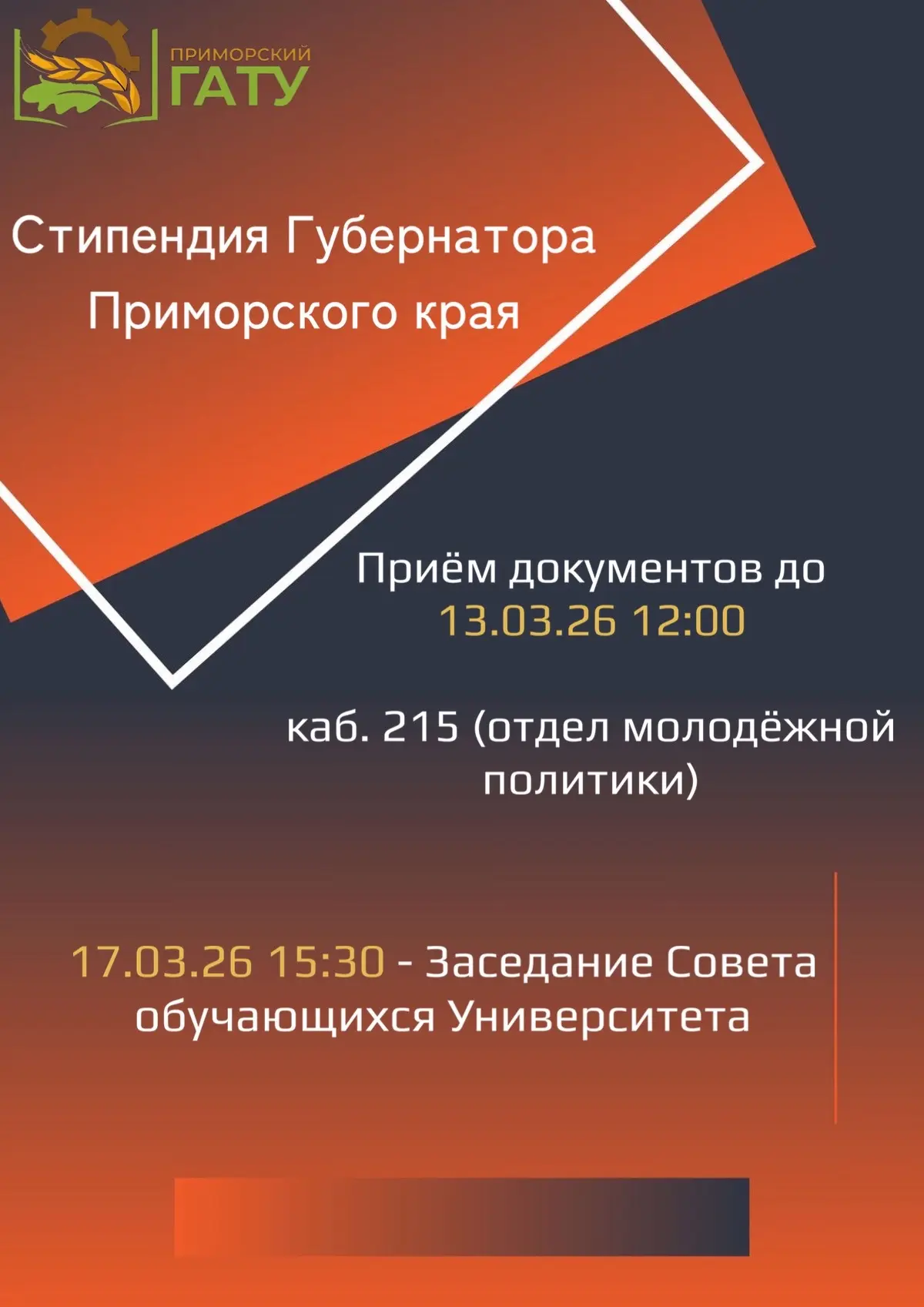 📌 Начинается приём документов от кандидатов на именные стипендии Губернатора Приморского края в главном корпусе ФГБОУ ВО Приморский ГАТУ, отдел молодёжной политики, каб. 215.